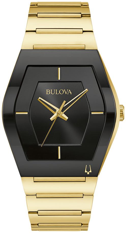 Distinctive asymmetrical tonneau shaped gold-tone stainless steel case with a black signature Futuro edge to edge curved metalized crystal features a black dial with gold-tone accents, and a gold-tone stainless steel bracelet. The watch features a three-hand quartz movement, deployant buckle with pushers, and water resistance to 30 meters.