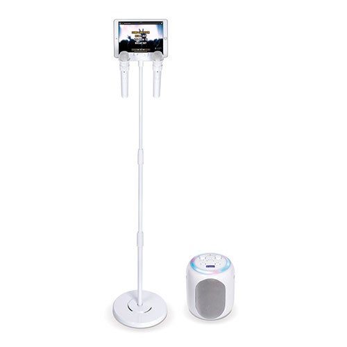 Exclusive Pitch Lab technology brings studio quality vocal enhancements home. 50 Watt high output speakers. Record up to 5 minutes of performance. Bluetooth wirelessly streams audio. Music synchronized with a glowing light show. Features mic stand with device holder for phones and tablets. Built-in rechargeable battery provides up to 10 hours of fun on a single charge. Singing Machine app - stream thousands of karaoke songs on demand. Singing Machine app requires paid subscription. Includes: 2 Wireless microphones. Microphone stand. AC adapter.