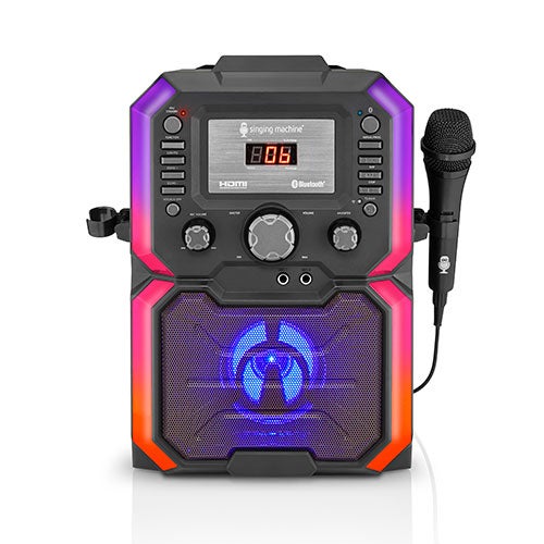 K-box karaoke machine is the first of its kind to feature video casting technology. Video Casting technology - project SMC Karaoke app content to TV wirelessly. Bluetooth audio streaming. Line in plays from a music device. Lead vocal off controls. Multi-colored LED lights synchronize to the music. 2 Microphone jacks with volume control. Powerful clear sound with 15W of sound. Tablet cradle with anti-slip silicon. Disco lighting effect and Echo effect. Includes: AC adapter. One wired microphone. 1 Free month access to Singing Machine app.