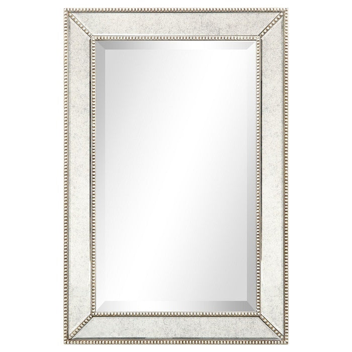 This wall mirror is raised slightly from its surrounds by a 1-inch bevel that helps the mirror to project a presence into the room, while also providing a space for adornment. The mirror has a silver pattern with bronze beads that recalls a royal style.