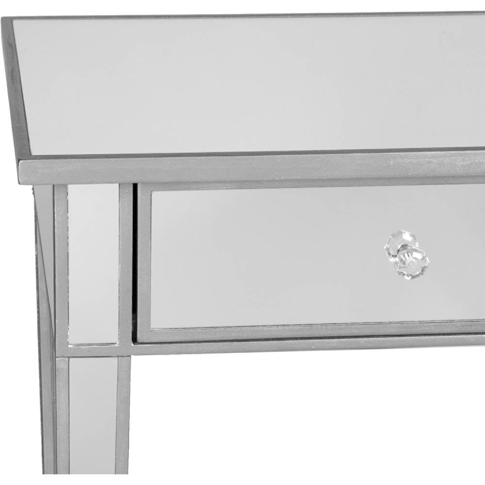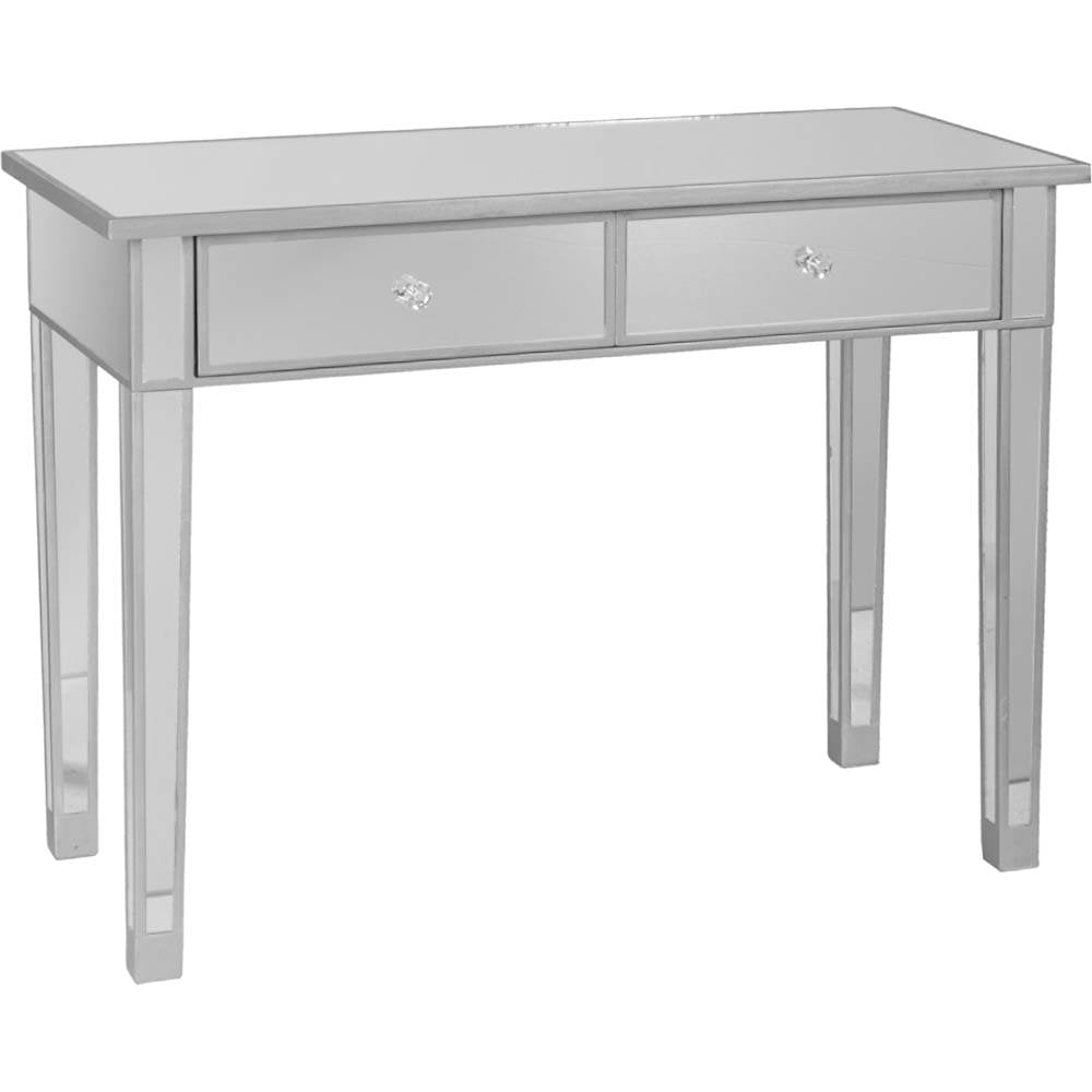 Reduce clutter in your home's entry or living room with this SEI Furniture Mirage mirrored console table. Faux crystal knobs provide easy access to the two mirrored drawers, and the spacious top offers room to display photographs and keepsakes. This SEI Furniture Mirage mirrored console table has matte silver accents for a modern style.