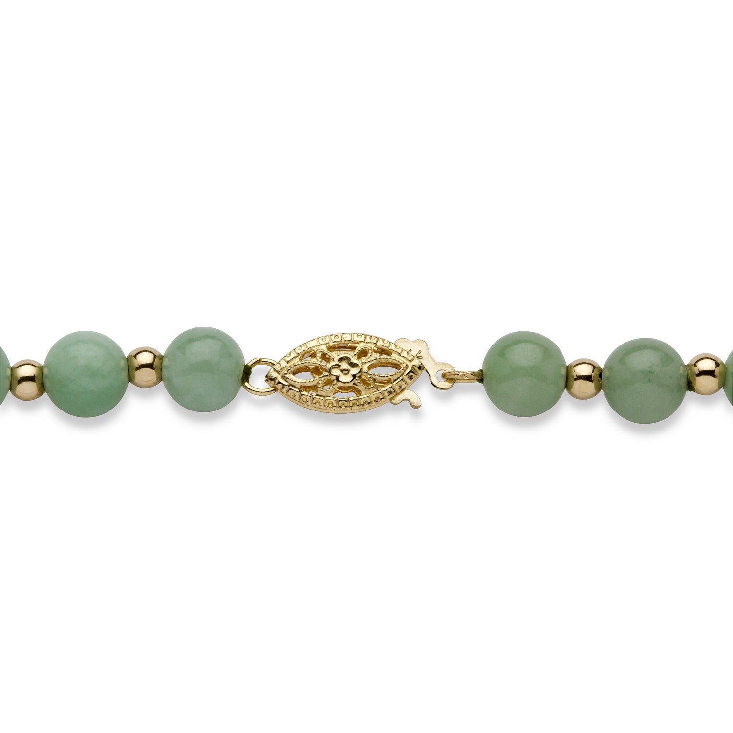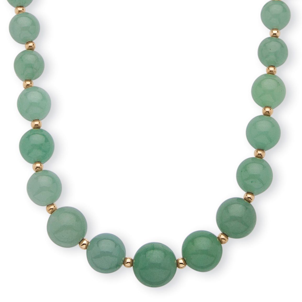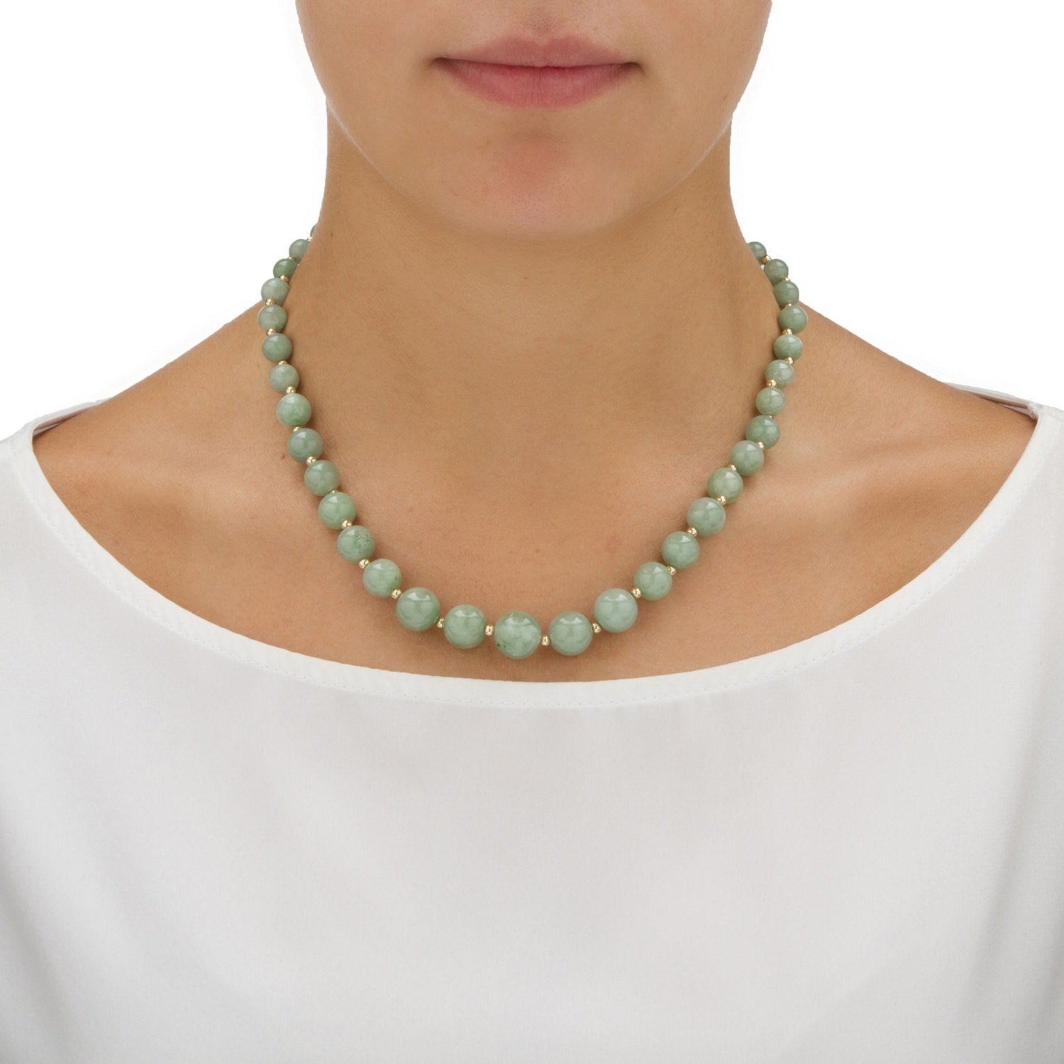 Discover the unique beauty of green jade with this graduated beaded necklace designed to add timeless elegance to any wardrobe with its luxury look. 6 to 12 mm. 18" length. 10k gold. As this items contains genuine jade, the actual stone colors may vary slightly.