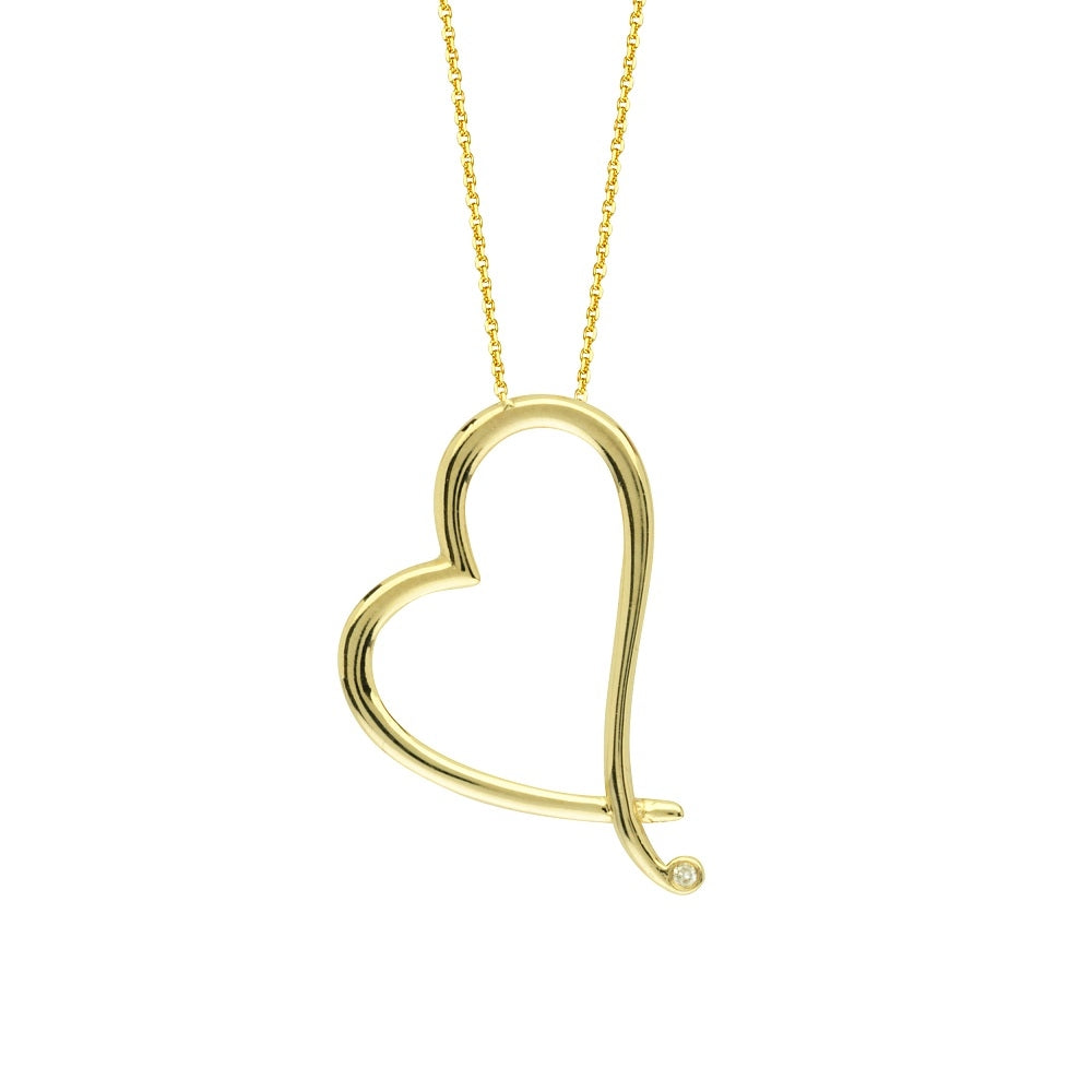 Simple and elegant, this slanted heart pendant adds a quick touch of style to any outfit. This 14kt yellow gold pendant boasts a simple 1pt diamond accent at the base of the heart for extra flair. Pendant comes suspended on a 16-18 inch adjustable chain with a lobster lock.