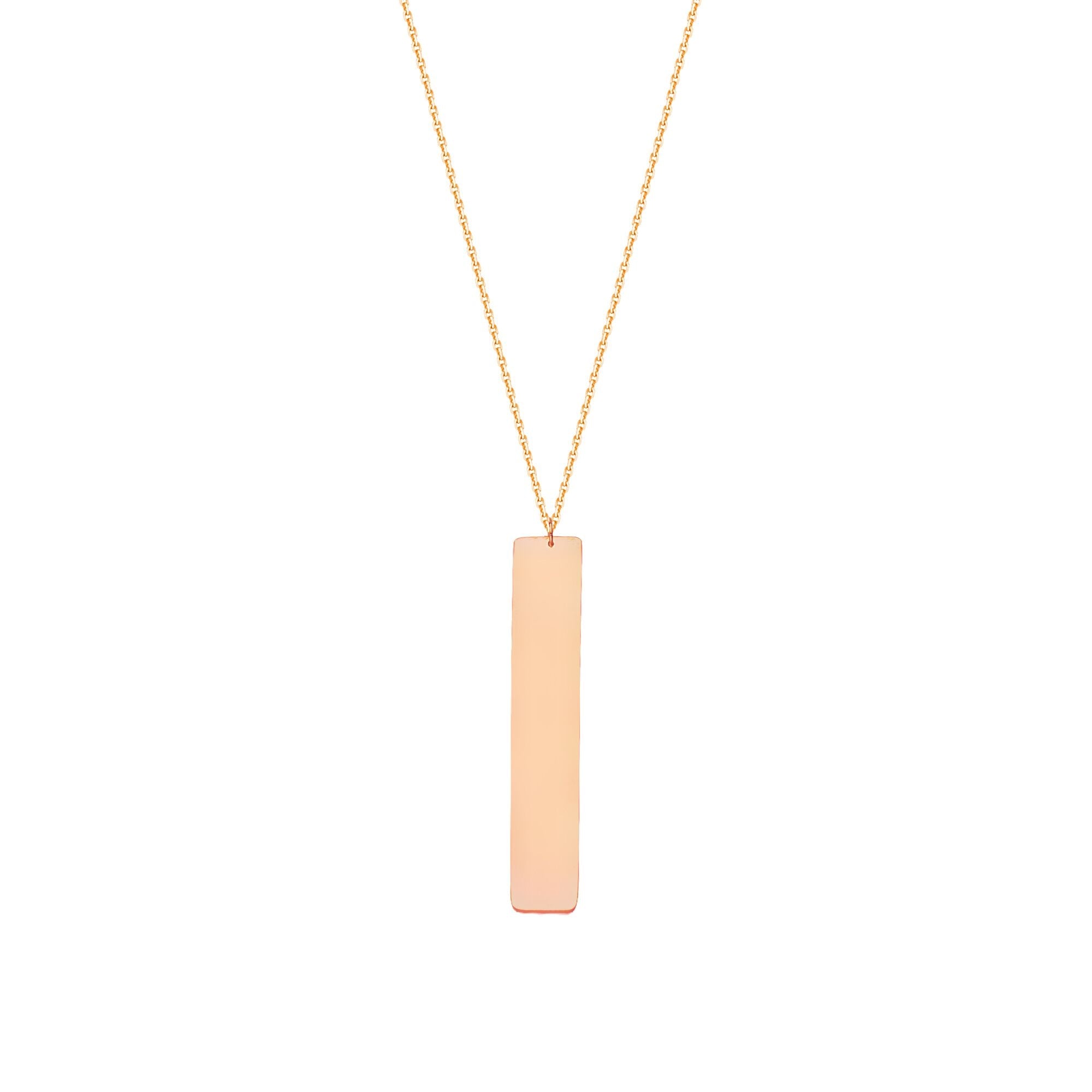 A modern and eye-catching spin on the popular bar necklace! This 14kt Pink Gold Vertical Bar Necklace features an adjustable 16-18 inches with a lobster clasp.