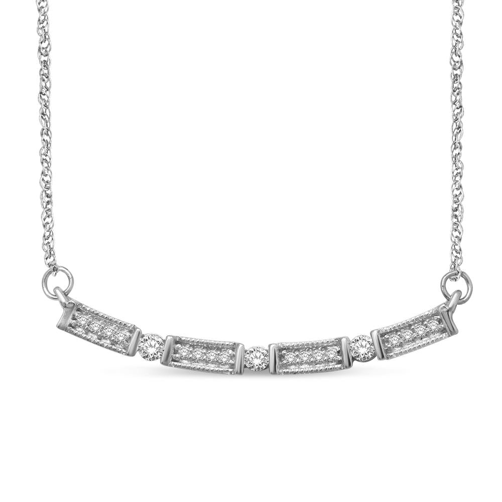 Make a statement with this intriguing diamond stackable necklace. Crafted in cool 14K white gold, this unique design feature rectangle frames attached with three solitaire diamonds. Radiant with 1/6 ctw brilliant cut diamonds. This dramatic design suspends along a 18 inch cable chain.