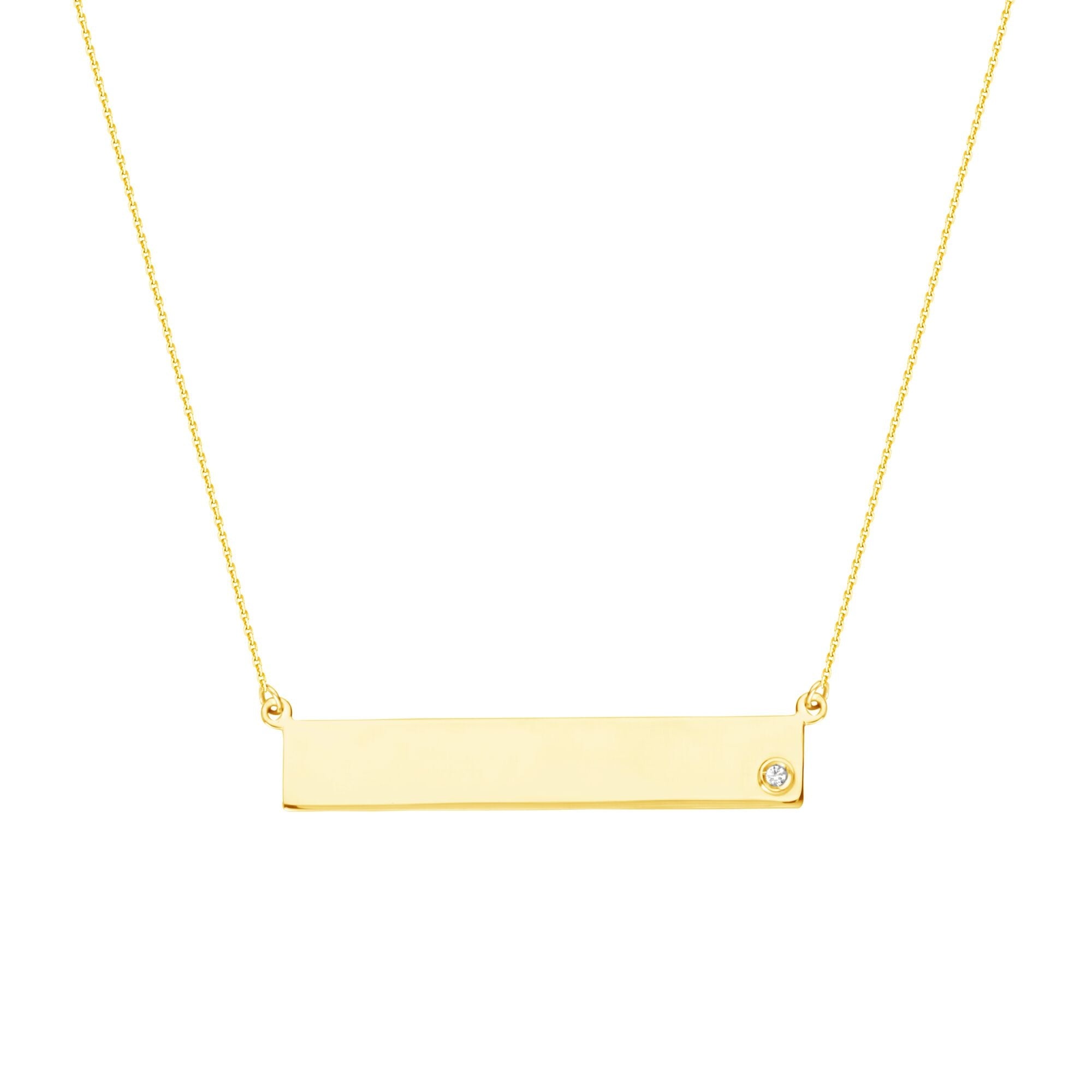 14kt Yellow Gold Bar Necklace with a 1 point round diamond set in a bezel settting. Ajustable 16-18 inches with a lobster clasp.