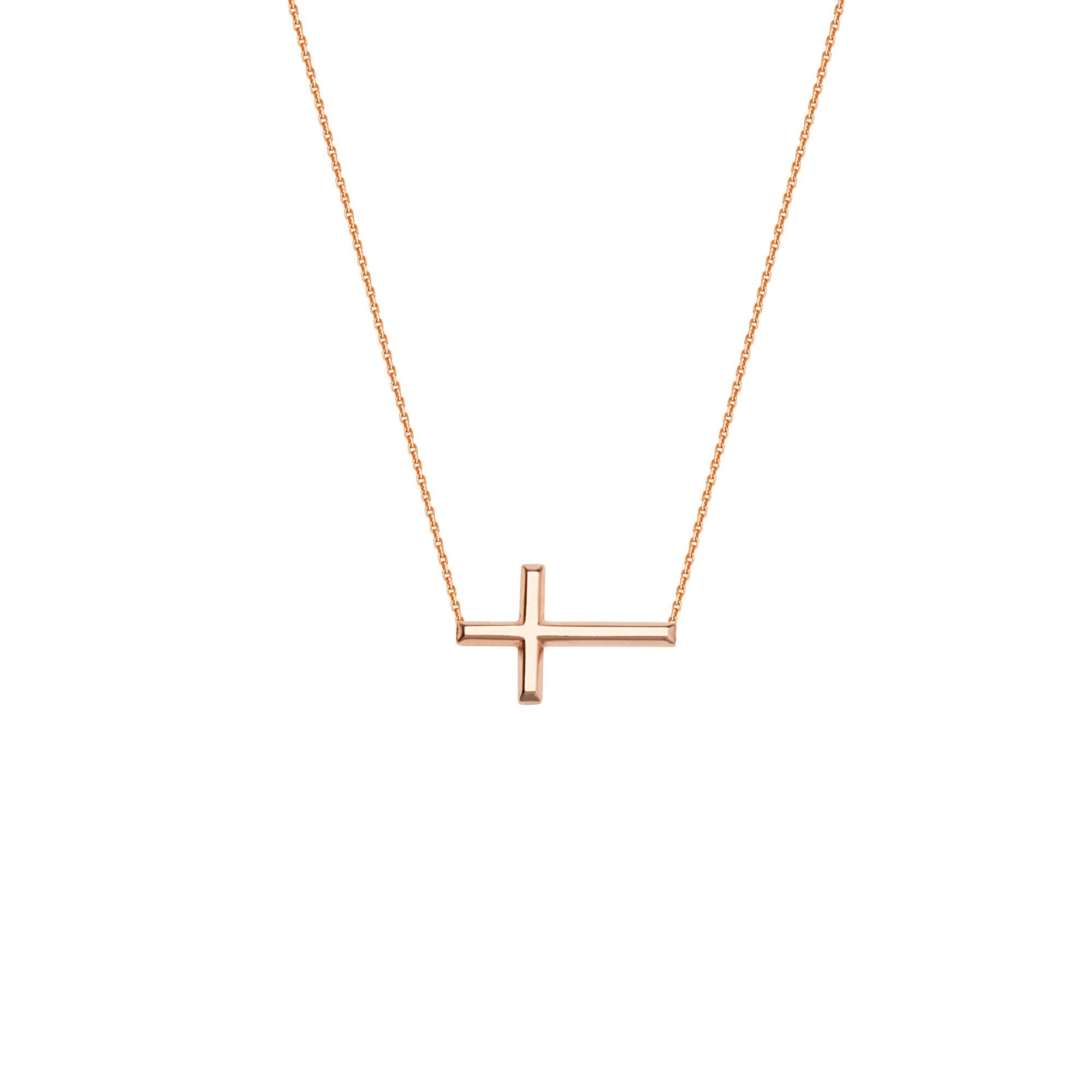 Honor your faith with this dainty 14kt Pink Gold sideways cross necklace, suspended on a 16-18 adjustable diamond cut cable chain with lobster clasp.