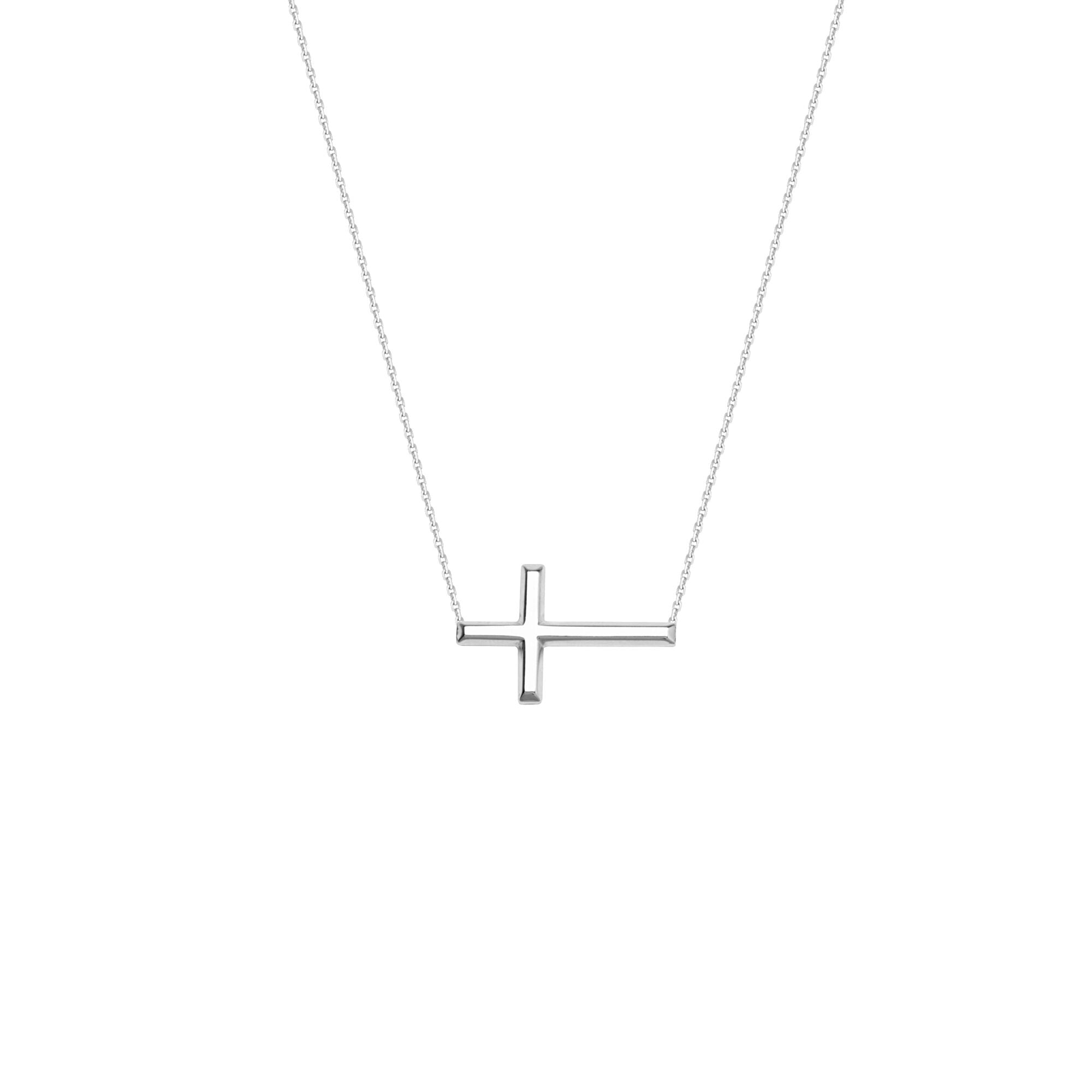 Honor your faith with this dainty 14kt White Gold sideways cross necklace, suspended on a 16-18 adjustable diamond cut cable chain with lobster clasp.