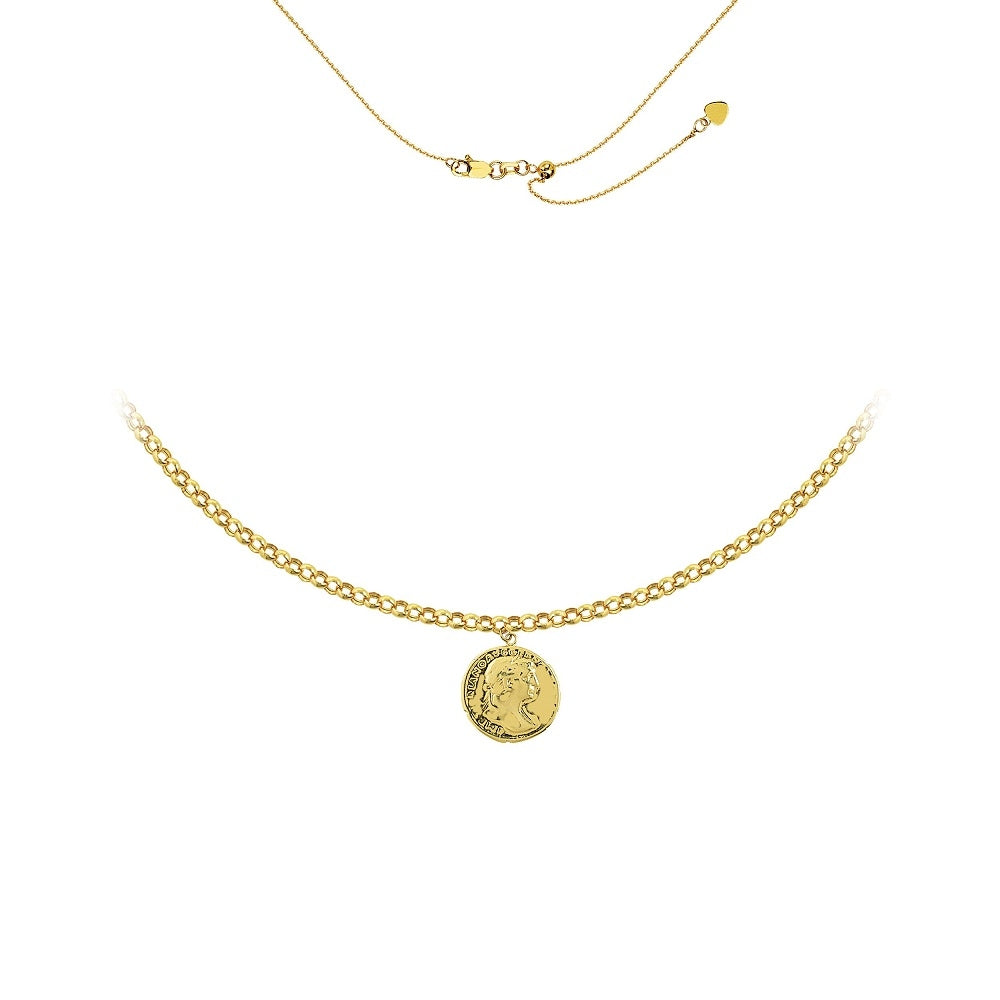 This intricate 14kt yellow gold dangle coin charm choker necklace is sure to become a new favorite in your jewelry collection. It is suspended on a rolo and diamond cut cable chain that adjusts up to 17 inches with a lobster clasp and dangle heart.