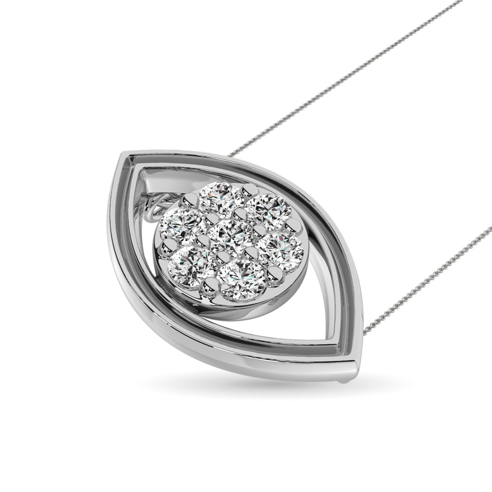 This glamorus pendant is available in 10k White Gold. There are 7 round diamonds with a total carat weight of 0.13ct set in a Prong setting. The pendant suspended with 18 inch chain that secures with a spring-ring clasp.