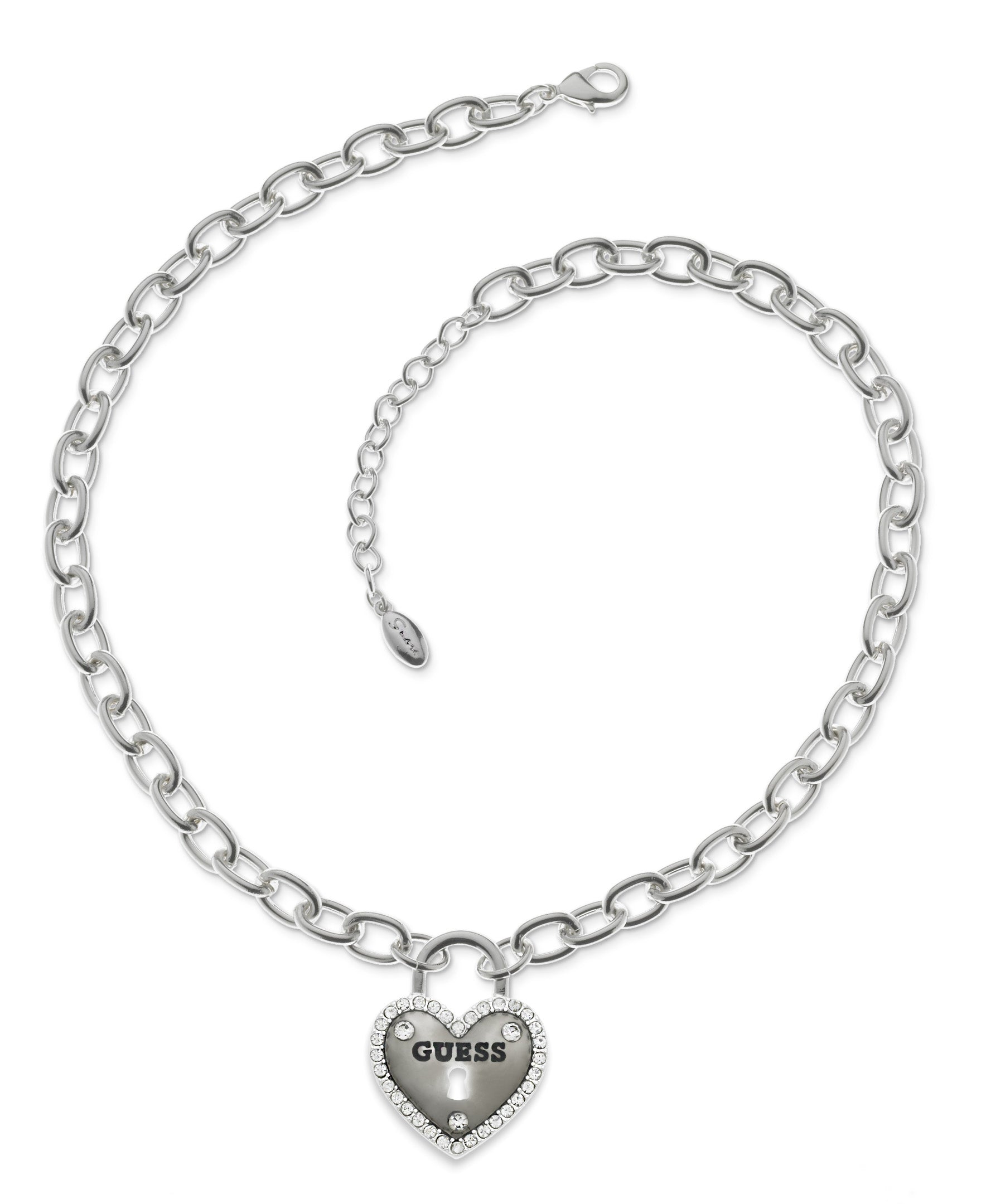 Silver-tone necklace features a Guess-stamped, heart-shaped lock charm. Length 16''.