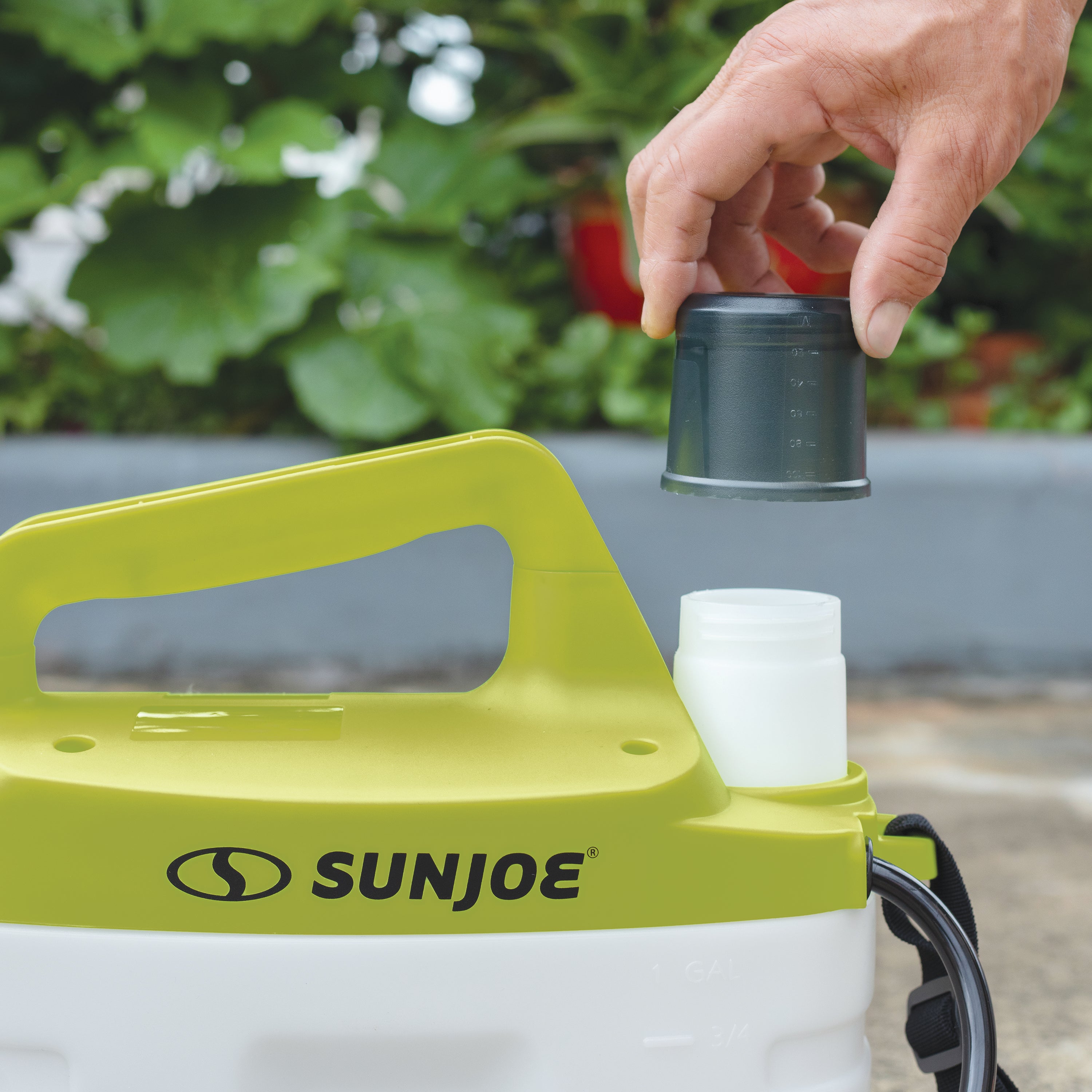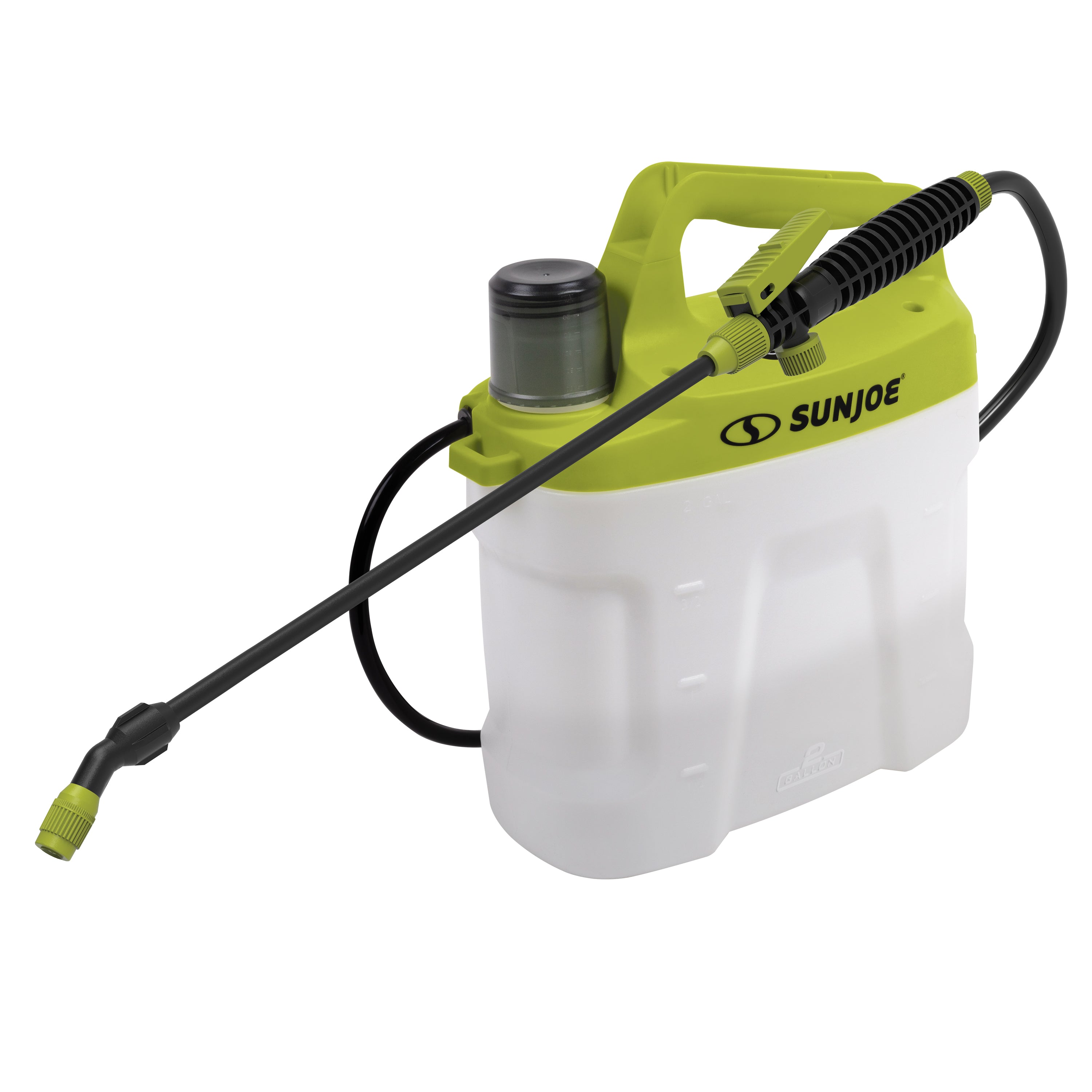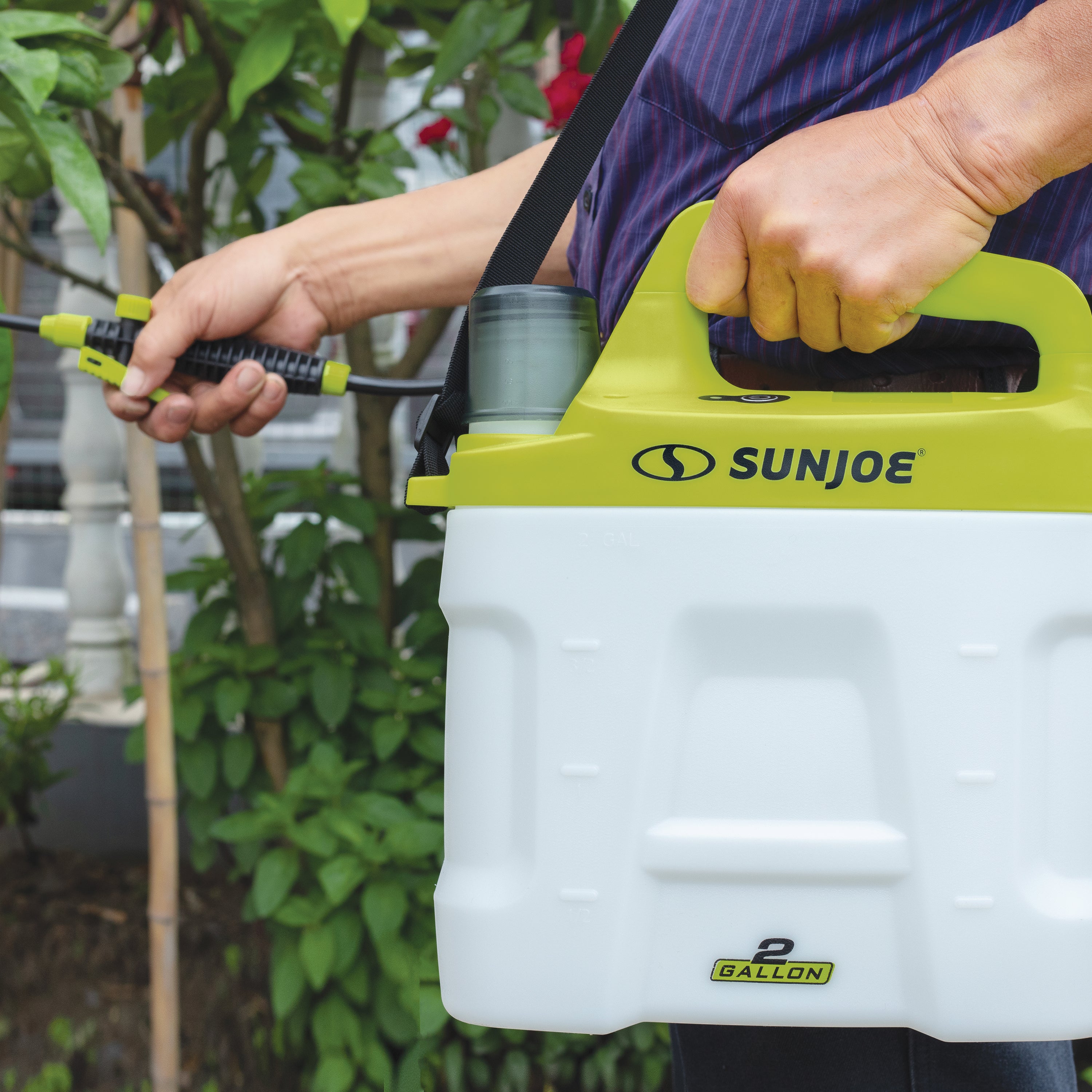 Spray up to 15 gallons of your chemical of choice per charge to quickly clean + sanitize kitchens, bathrooms, retail spaces, restrooms and other high-touch surfaces; treat your garden and rid your yard of weeds and unwanted pests, or even spray liquid fertilizer! The translucent tank holds up to 2 gallons of chemical solution and comes equipped with an onboard, 3.4 fl oz measuring cup to perfectly portion your mixture. And the 20-inch wand evenly distributes spray over large areas, applies in tight spaces, or reaches down low to tackle plant diseases or pests right at the roots. Plus, the sturdy carrying handle and shoulder strap, lightweight design and cord-free convenience makes SUN JOE easy to tote around your home, yard + garden – or anywhere power is at a premium. And when the job is done, simply clean out the tank and spray gun for years of continuous use. So, fight back against germs, pests and weeds and GET EQUIPPED® with the 4-Volt Cordless All-Purpose Chemical Sprayer from SUN JOE®. Internal 4-volt lithium-ion battery provides up to 4 hours of continuous runtime.Powerful 3-watt motor sprays up to 15 gallons per charge.Perfect for sanitizing large areas, spraying cleaning and sanitizing solutions, clearing away unwanted weeds, vegetation, treating plant disease, applying pesticide, liquid fertilizer, and more!20-inch spray wand is ideal for applying over large or targeted areas.Spray nozzle adjusts with a twist, from jet stream to fan spray.Lightweight design with shoulder strap for added support just 20 lbs with a full tank.Onboard 3.4 fl oz measuring cup makes it easy to dilute and portion chemicals.