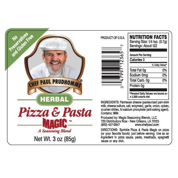 The Chef Paul Prudhommes Herbal Pizza and Pasta Magic is a ready-to-use seasoning blend. Made with pure Parmesan cheese and herbs, this seasoning blend can be sprinkled on soups, salads, pizzas, and pasta. The Chef Paul Prudhommes Seasoning Blend is ideal for restaurants and diners.