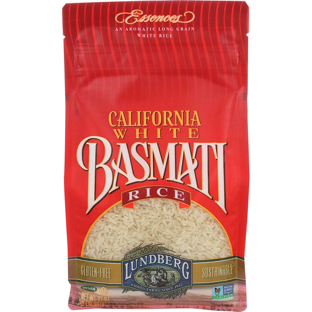 LUNDBERG FAMILY FARMS RICE, BASMATI, CALIFORNIA WHITE IS A NATURAL, NON-GMO WHOLE GRAIN. FREE FROM ANY ADDITIVES OR OTHER SUBSTANCES, LUNDBERG FAMILY FARMS RICE IS PURE AND NUTRIENT RICH. LUNDBERG FAMILY FARMS RICE IS MANUFACTURED WITH RENEWABLE ENERGY AND SUSTAINABLE METHODS. THIS PRODUCT IS GLUTEN FREE, Kosher AND NON-GMO. EACH BAG OF LUNDBERG FAMILY FARMS RICE, BASMATI, CALIFORNIA WHITE WEIGHS 32 OZ. WITH 20 SERVINGS PER BAG AND 160 CALORIES PER SERVING. STORE IN A COOL, DRY PLACE. SEE NUTRITION FACTS PANEL FOR ALLERGENS.