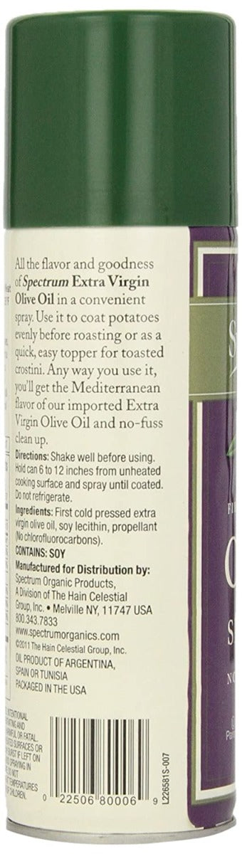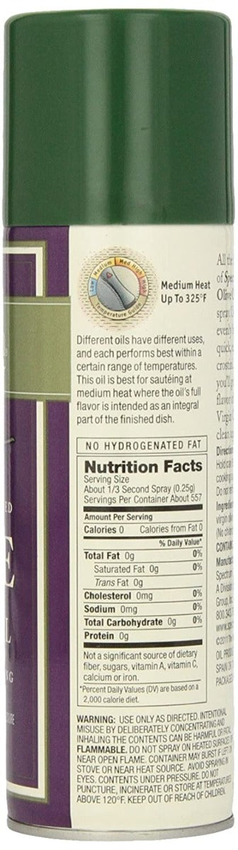 Spectrum naturals olive oil cooking spray is the chef's choice for all-purpose cooking. This oil is best for sauting or pan frying over medium high heat. Use our first cold pressed, extra virgin olive oil spray to coat your pan before roasting potatoes in the oven. Includes one 6 oz. Can of cholesterol and trans-fat free spectrum naturals olive oil cooking spray.