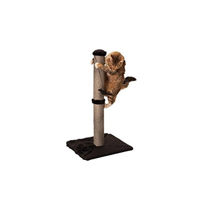 This 26" sisal scratching post helps keep your cat from scratching carpets or furniture by providing your pet a more satisfying surface to scratch and claw. Sisal's natural coarse and fibrous texture helps condition cat nails. Base and top are covered in chic yet durable designer fabric with natural sisal rope wrapped around the post. 2 bird toys, 1 hanging and 1 sprint action add hours of fun. Sisal fiber, wood and fabric construction.