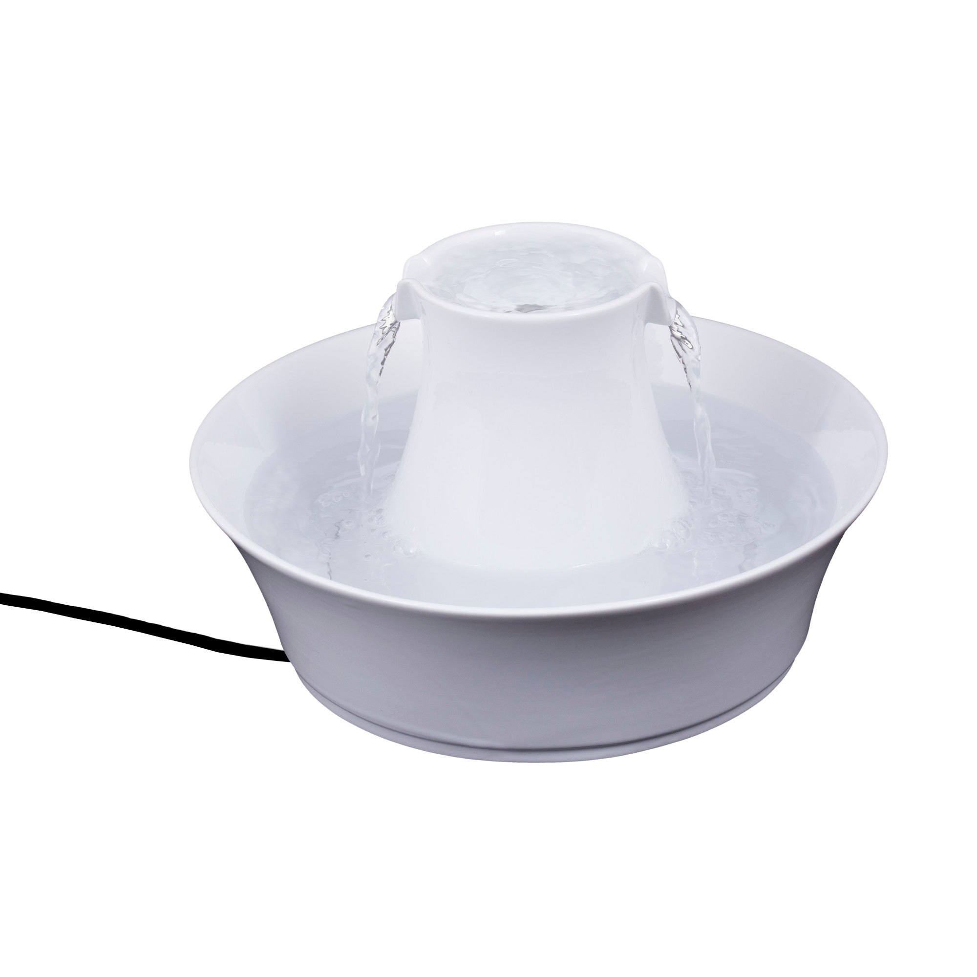 Drinkwell Ceramic Avalon Pet FountainFeatures two free-falling water streams to encourage your pet to drink more water. Free-falling stream adds more oxygen to the water to keep it fresh. Activated carbon filter removes bad tastes and odors from water. Foam filter helps catch pet hair and other debris. 70oz Water capacity is great for cats or small and medium sized dogs. Premium scratch resistant ceramic bowl helps inhibit bacteria growth. Pump is hand wash only. All other parts are top rack dishwasher safe. Includes: Ceramic bowl and tower. Carbon filter. Foam filter. Pump. Adapter.