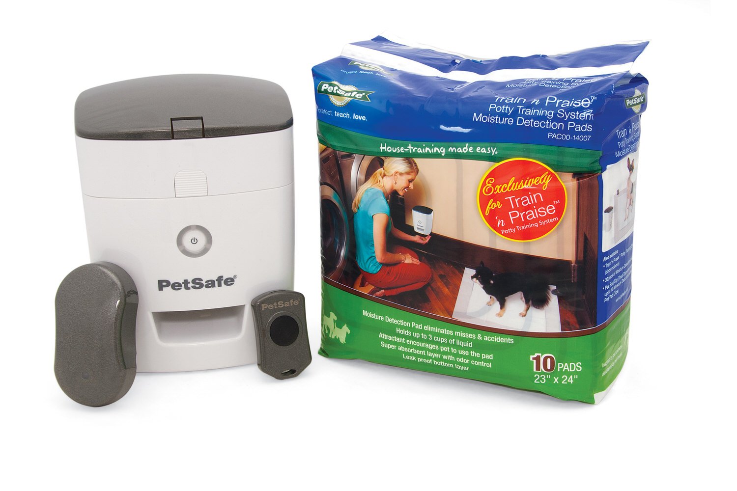 Training system consists of a treat dispenser and pee pad. When dog pees on the pee pad moisture alerts an internal sensor pad. The pad sensor wirelessly sends a signal to the dispenser to release a treat. Pad control unit easily attached and reattached to pee pads. Handheld remote dispenses up to 25ft away. Pad control unit is water resistant. On/Off switch. Low battery indicator. Works with treats/kibble up to 1/2" in size. Winner of Dr. Marty Beckers ?Becker?s Best Award" at Global Pet Expo.