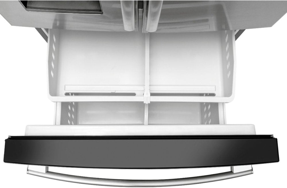 Spend less time shopping with this GE French door refrigerator. The bottom-mount freezer holds 8 cu. ft. of groceries in two storage baskets, while the drawers in the 17.5 cu. ft. fridge can be customized for temperature and humidity. This GE French door refrigerator includes an external water and ice dispenser for convenient beverages.