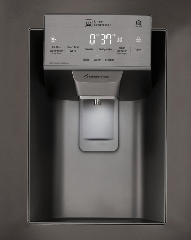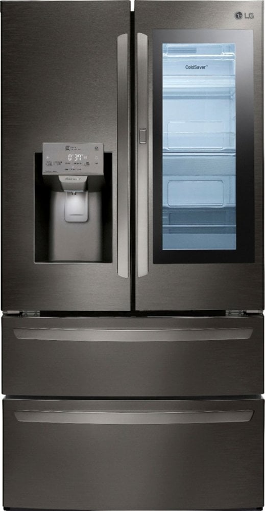 Chill fresh food in this 28.0 cu. ft. four-door LG refrigerator. Its smooth, black stainless steel finish is resistant to fingerprints and imparts a sleek, refined look, and the InstaView doors let you see items inside without wasting energy. The convenient double freezer drawers on this French door LG refrigerator allow easy access to frozen foods.