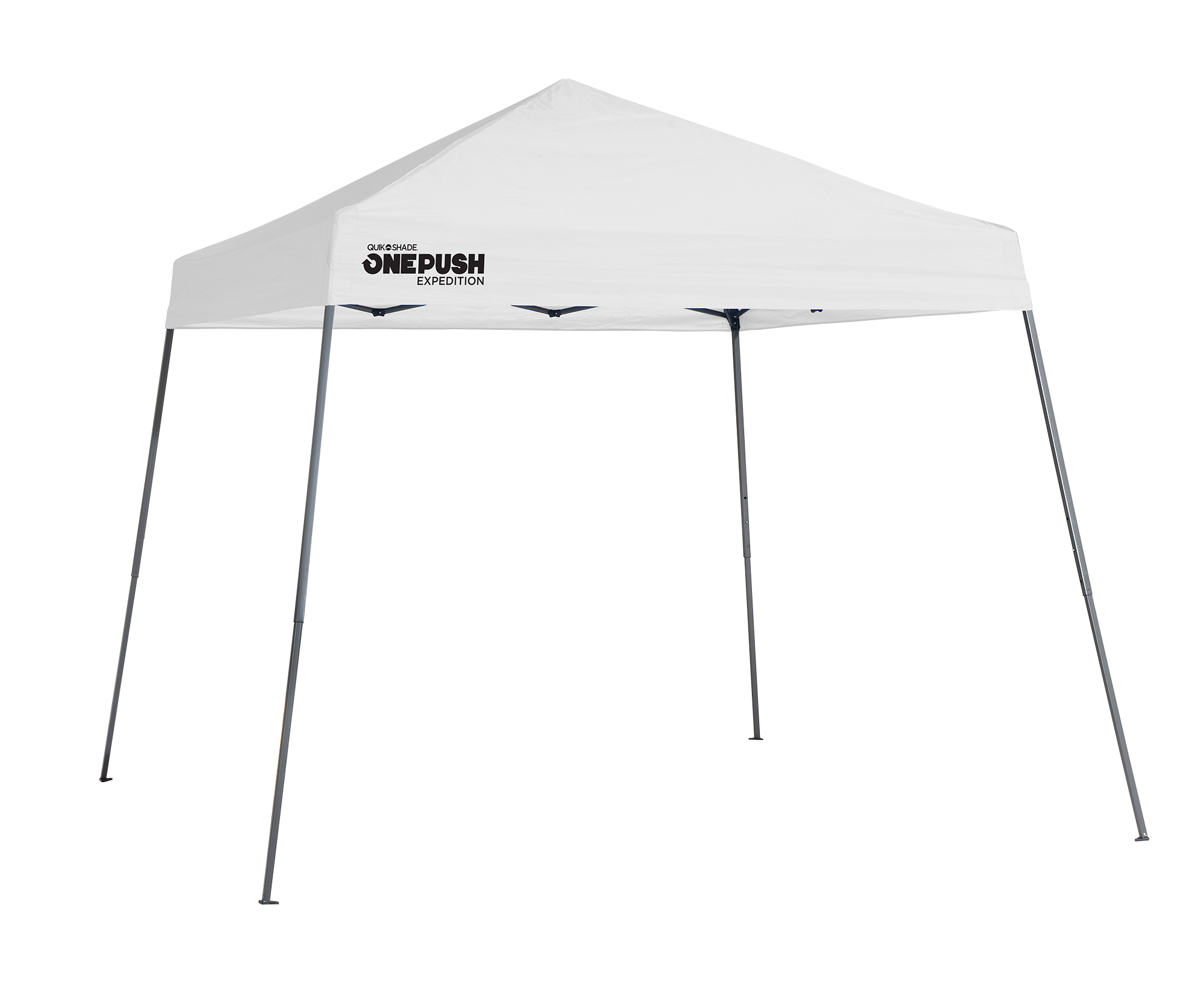 The Quik Shade Expedition OnePush revolutionizes canopy assembly! This quick and easy one step process makes out of the box assembly simple thanks to its instant setup mechanism. The One Push canopy features quick release push pins offering you three height adjustments for your canopy. Rigid overlapping eave construction offers stability to the frame, and the 150D polyester top with Aluminex provides up to 99% UV protection. 10 x 10 ft. canopy, up to 64 sq. ft. of shade. Slant leg canopy.