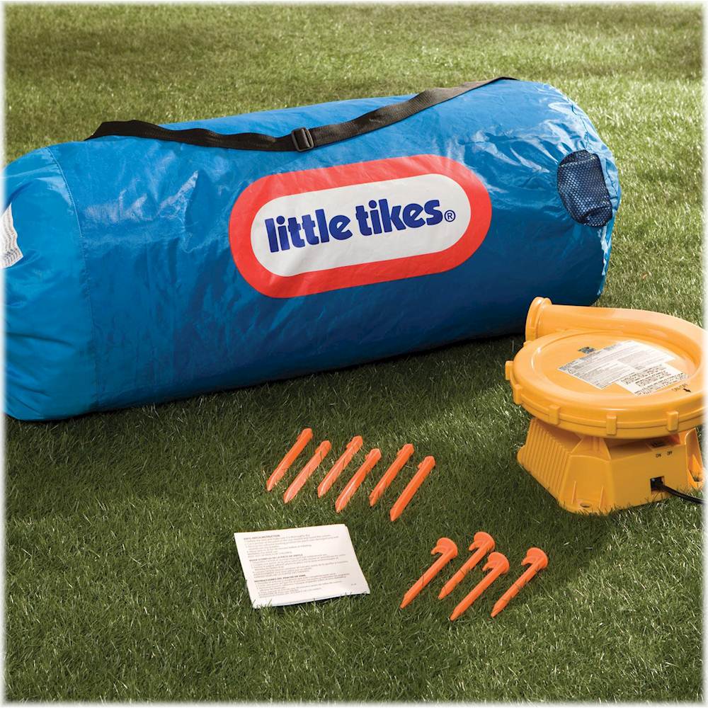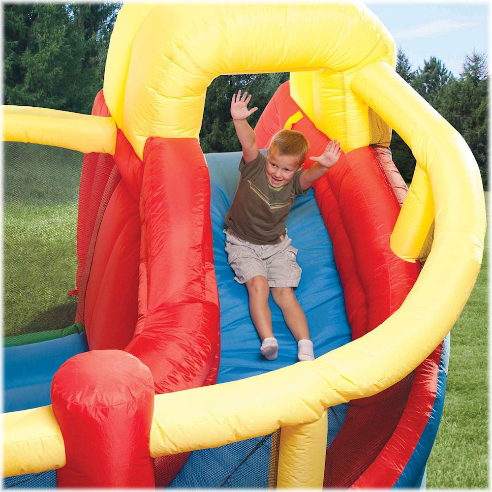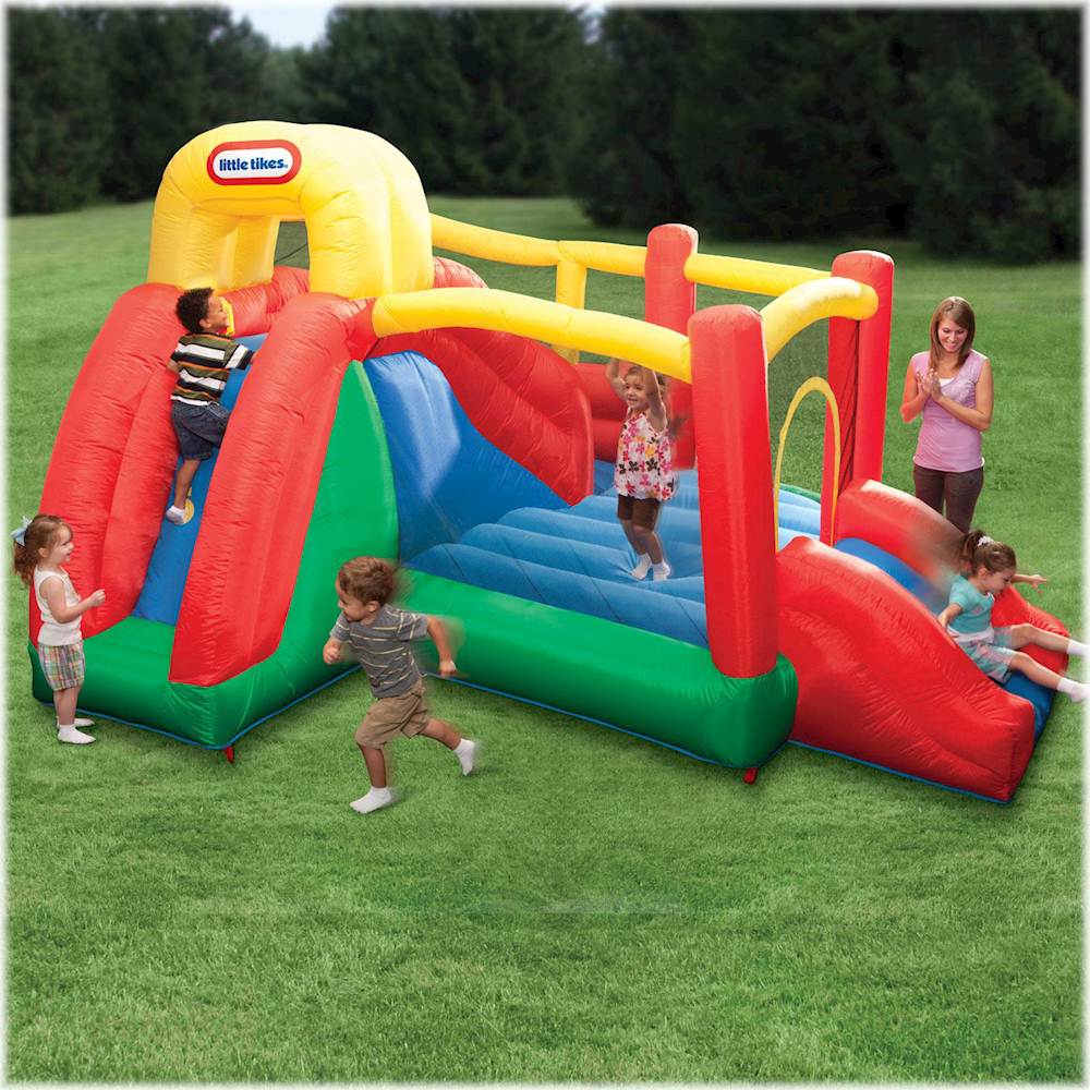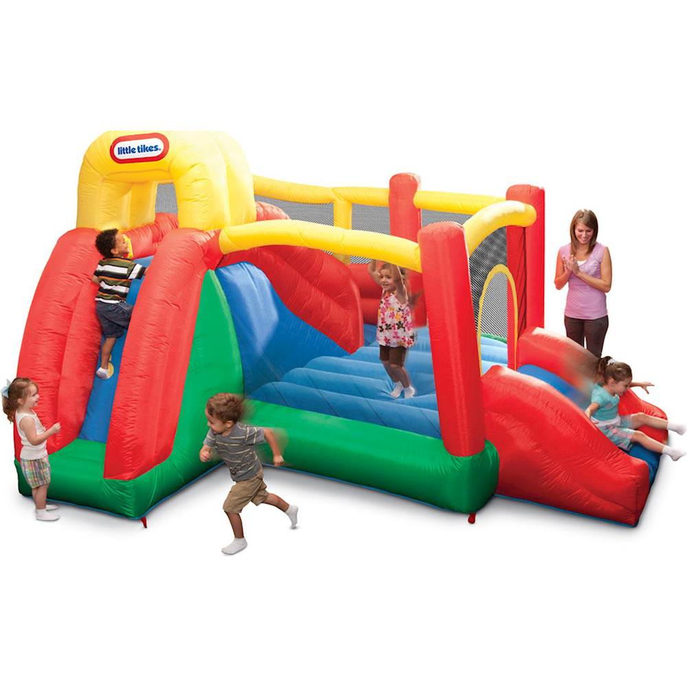 Offer your children unlimited fun with this inflatable Little Tikes Double Fun Slide 'n' Bounce bouncer. The bounce area has mesh sides for safety while the climbing wall provides an extra challenge. This Little Tikes Double Fun Slide 'n' Bounce bouncer has two fun-filled slides for double entertainment and permits up to a weight of 250 lbs. to accommodate three kids at once.