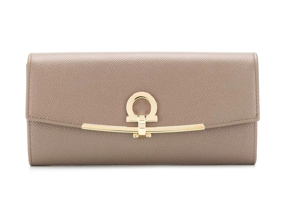 A sophisticated addition to your daily repertoire, this continental wallet in hammered calfskin leather presents the signature Gancini detail rendered here in a shiny gold hue for an extra dose of elegance. The neatly organized interior features multiple compartments and functional details, such as the practical tag suspended from a dainty chain strap, perfect for keeping your documents close at hand