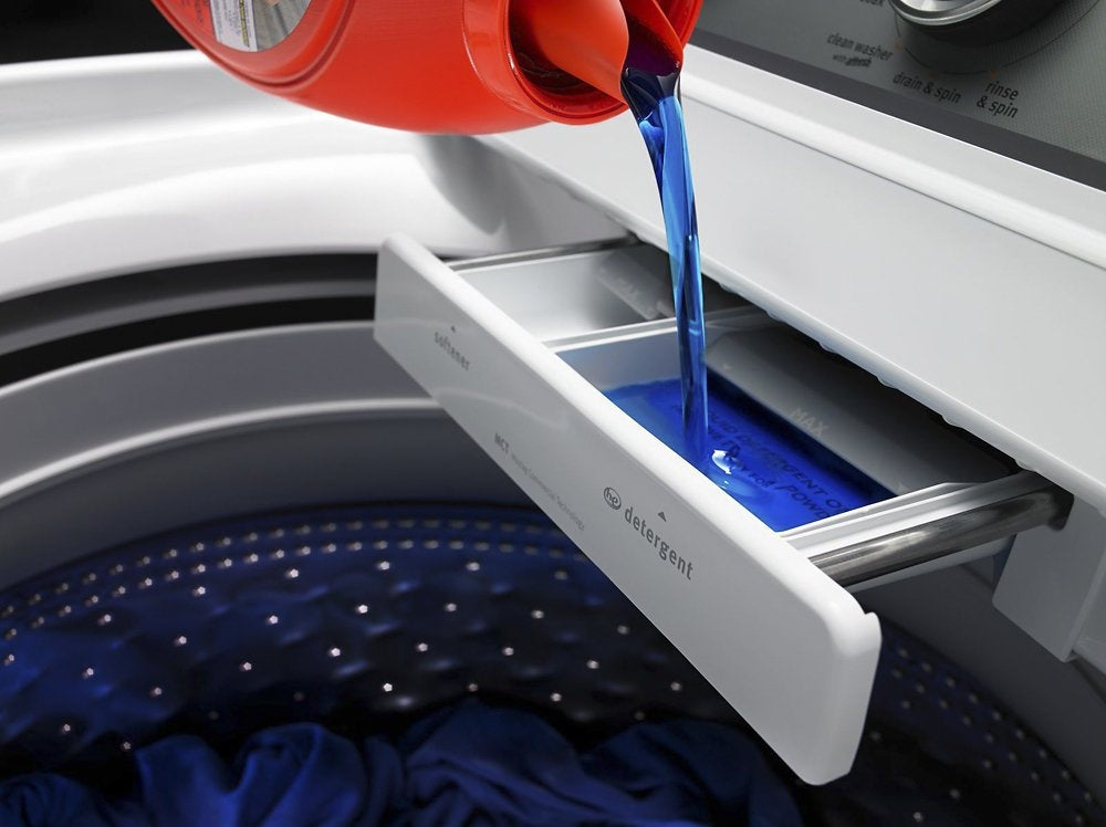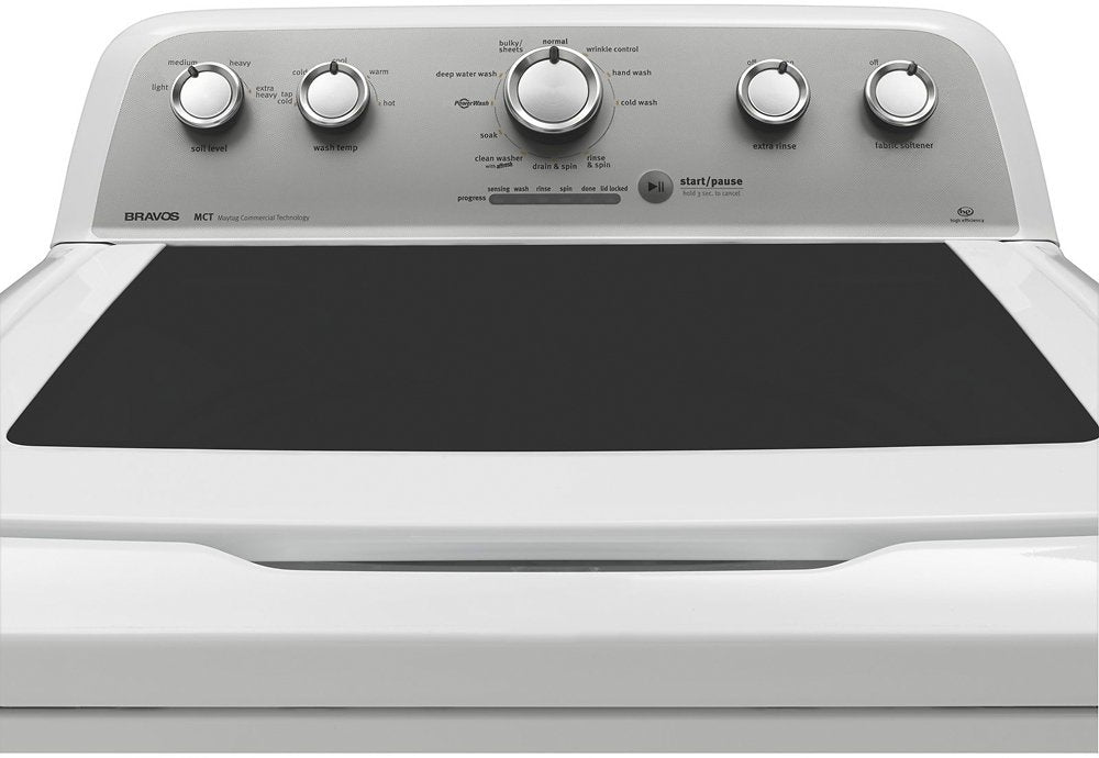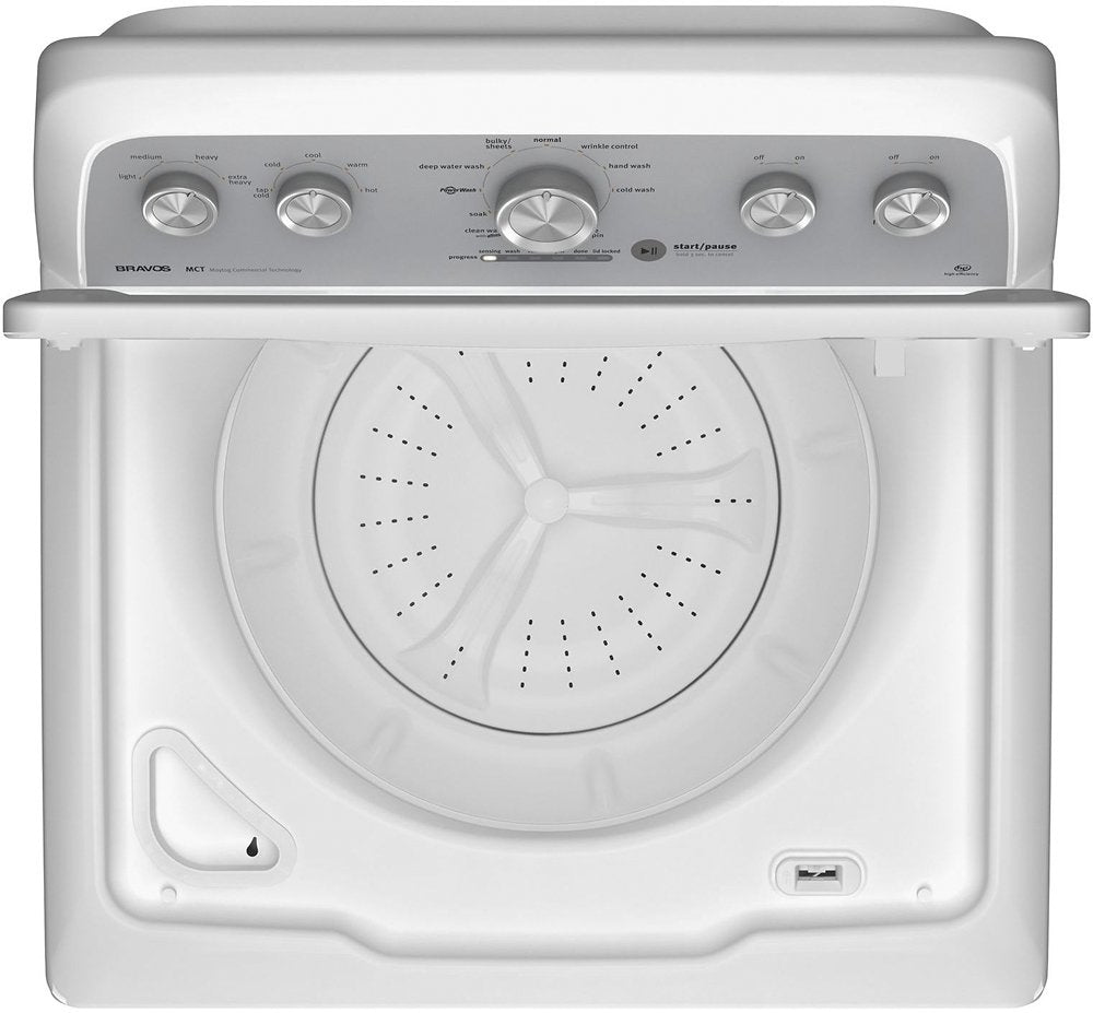 Tackle tough stains with this white top-loading washer from Maytag. The stainless steel basin provides 4.3 cubic feet of space - enough room for 18 towels in one load. The PowerWash system combats tough stains in clothing. This top-loading washer's deep wash cycle raises and lowers water levels automatically to ensure full submersion.