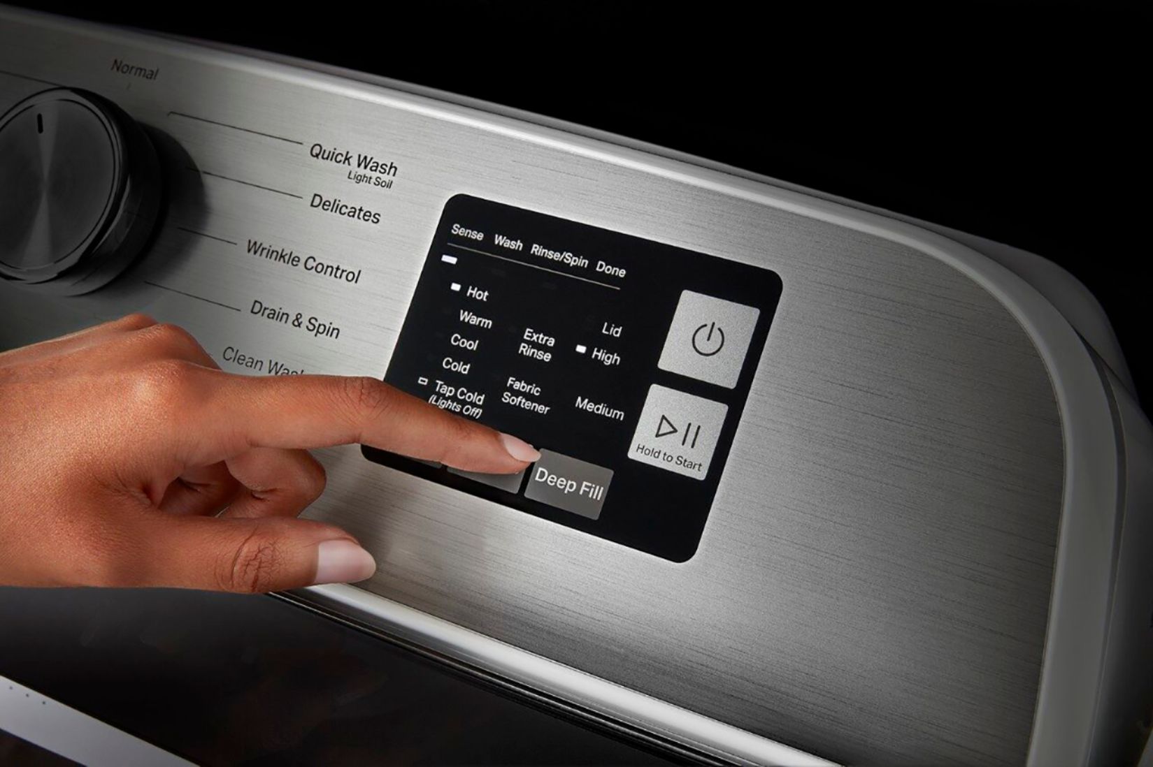 For more water when you want it, select the Deep Fill option to fill the wash basket with your choice of deeper water levels. The extra water works with robust wash action to effectively break down and rinse away everyday tough messes.