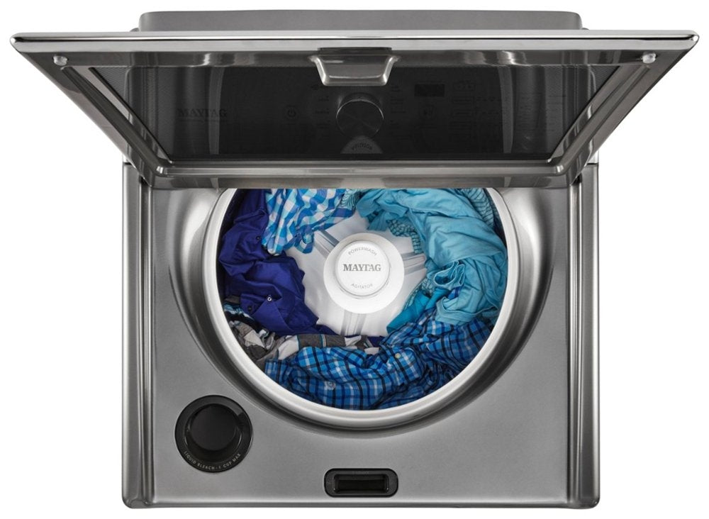 Keep clothes clean with this 5.2 cu. ft. Maytag top-load washer. Its Deep Fill option provides more water when needed to rinse away dirt, and its PowerWash agitator breaks up messes to remove stains. The durable stainless steel wash basket of this Maytag top-load washer wicks moisture away from clothes to prepare them for drying.