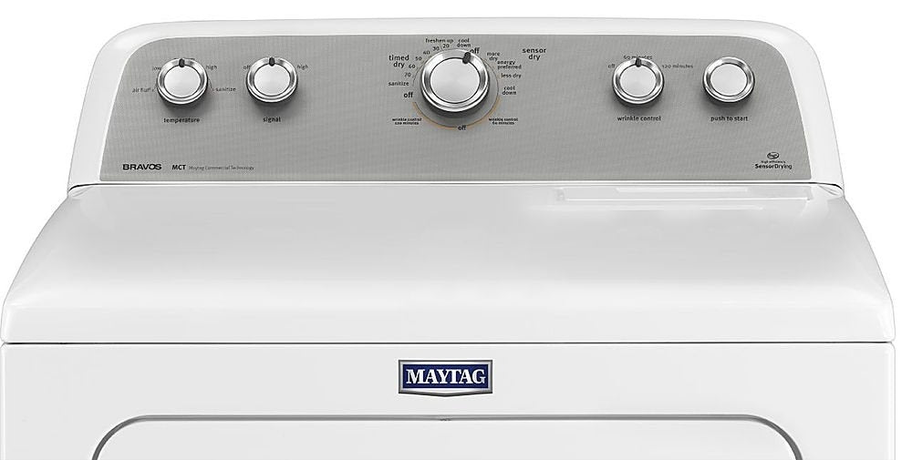 Combat wrinkles and get clothes dry with this gas dryer from Maytag. It features a sanitize cycle that removes 99.9 percent of common household bacteria. The machine is equipped with an IntelliDry Sensor that automatically stops the cycle when the clothes are dry. The gas dryer has a 7.0-cubic-foot drum that holds large bedding items.