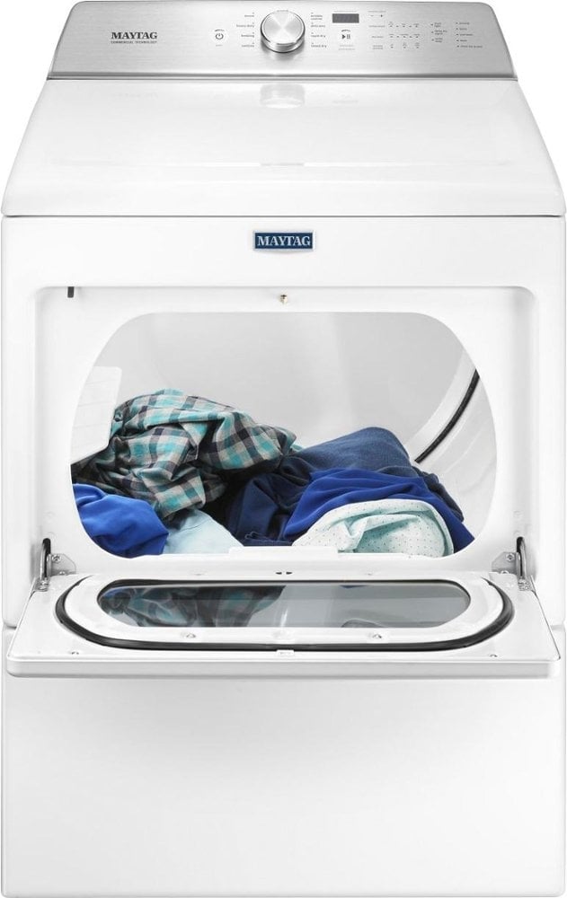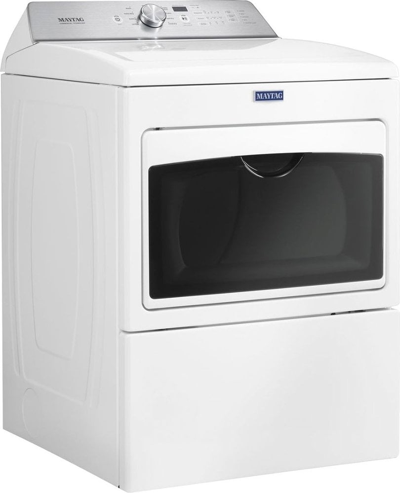 Dry clothes quickly in this front-loading Maytag electric dryer. The 7.4 cu. ft. capacity lets you dry up to 18 towels in one load, and the dryer keeps tumbling after the cycle ends to prevent wrinkles in your clothes. Find every sock with the interior light of this front-loading Maytag electric dryer.