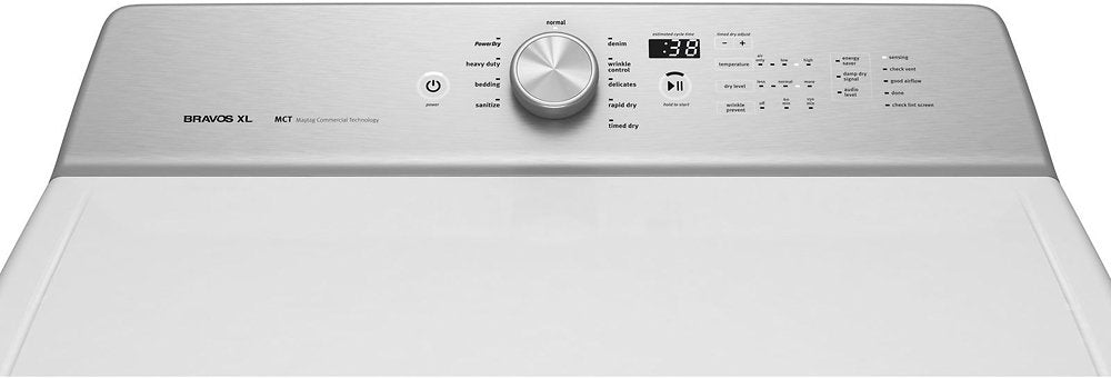 Dry clothing evenly with this Maytag extra-large electric dryer. The PowerDry cycle maximizes heat and airflow to get large loads dry quickly. Keep fabrics smooth with the Wrinkle Prevent option that tumbles clothes intermittently when the cycle ends. This Maytag electric dryer's 8.8-cubic-foot drum can dry 21 towels at once while maintaining high speeds.