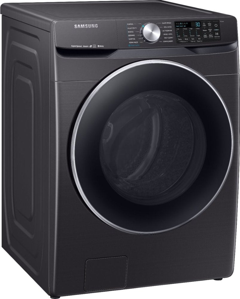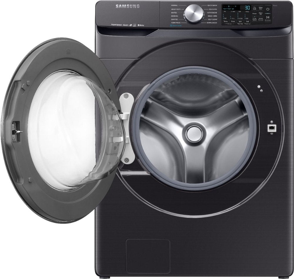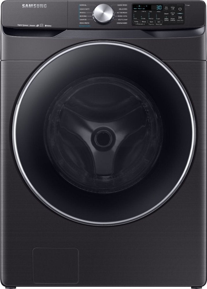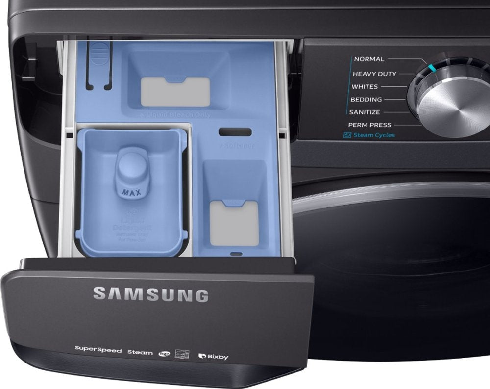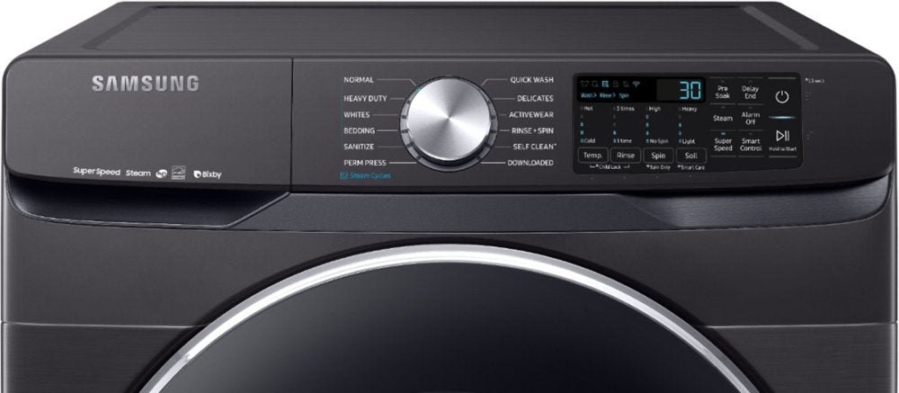 Samsung's new 4.5 cu. ft. capacity front-load washer featuring Super Speed allows you to wash a full load of laundry in just 30 minutes, without sacrificing cleaning performance. With Bixby enabled Wi-Fi connectivity, this washer allows you to remotely start or stop your cycle, schedule laundry on your time, receive end of cycle alerts, and more right from your smartphone. With Steam cleaning, you can eliminate stains without the need to pretreat. Bring inspiration to your laundry room with beautiful designer colors, including Samsung's new fingerprint-resistant black stainless steel finish.