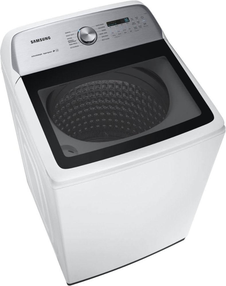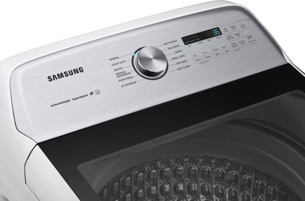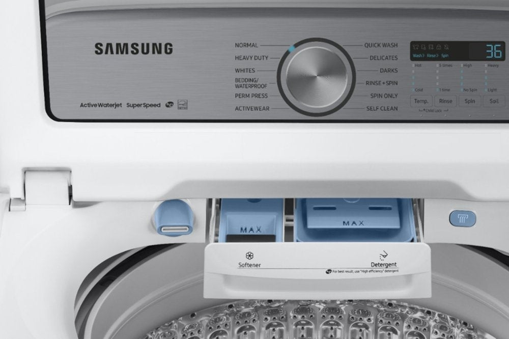 Samsung's new 5.0 cu. ft. capacity top-load washer features Super Speed technology, which allows you to wash a full load in just 36 minutes without sacrificing cleaning performance. It is also equipped with Active WaterJet - a built-in faucet that lets you pre-treat stained clothes with a press of a button - and an EZ Access tub design that allows you to easily reach the bottom of the washer tub, stretch- free.