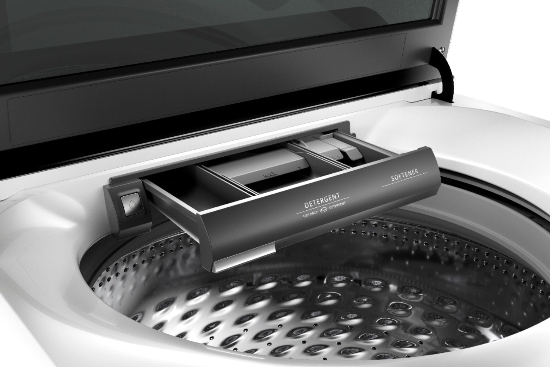 Single-load dispenser drawerAdd detergent, bleach, and fabric softener to their designated compartments so each gets dispensed at just the right time during the cycle.