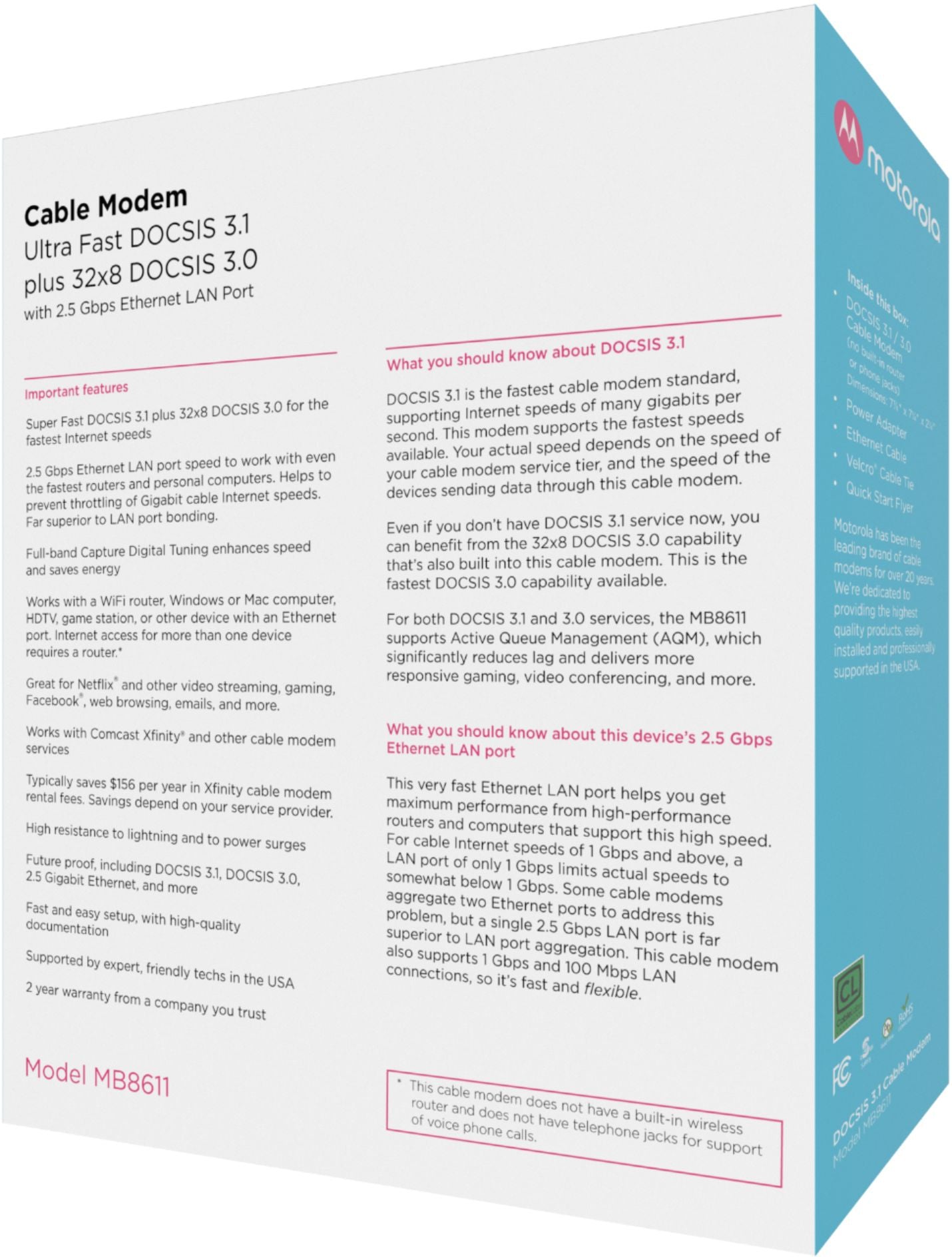 The Motorola MB8611 Ultra-fast DOCSIS 3.1 cable modem supports true Gigabit speed tiers with a 2.5 GB Ethernet port. Approved for Comcast Xfinity, Cox, and Charter Spectrum services only. This cable modem is backwards compatible with 32x8 DOCSIS 3.0.