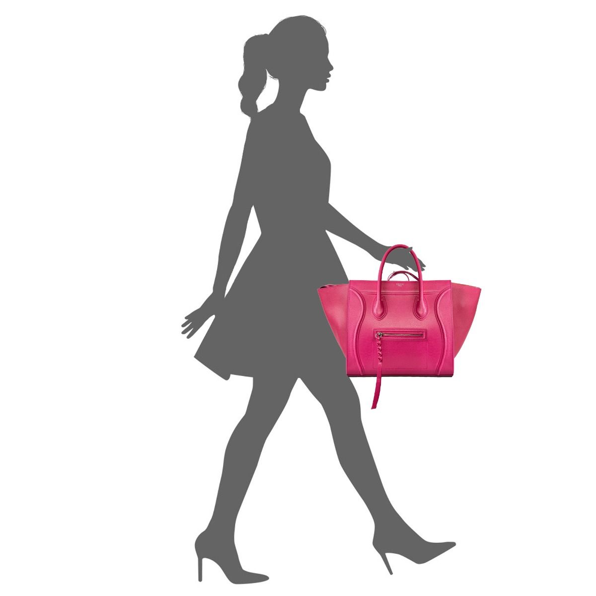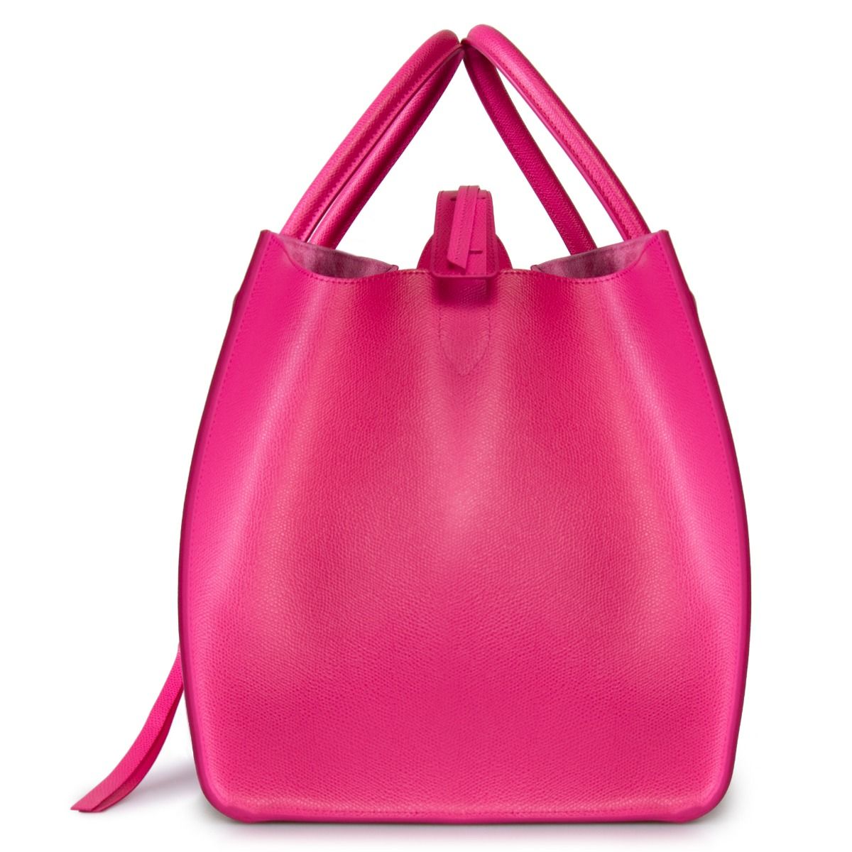 The bigger, the better is the case with this Celine fuchsia medium Luggage Phantom bag. Made with baby grained calfskin and lined with split calfskin all in fuchsia  this designer bag is practical and masterfully crafted. The top of the bag is held together by a simple latch opening unto a simple interior, which has a side zip pocket for small items. The steel hardware is visible in the front zip pocket, which has a leather tasseled keychain. Measuring 12 inches W x 11 inches H x 9 inches D, this item ships with a Celine dust bag and the designer's documents of authenticity. Made in Italy.