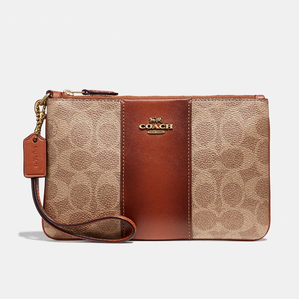 Crafted in our Signature canvas with colorblock leather trim, this wristlet is perfectly sized for cards, cash and a phone. Wear it on your wrist or clip it inside a larger Coach bag.
