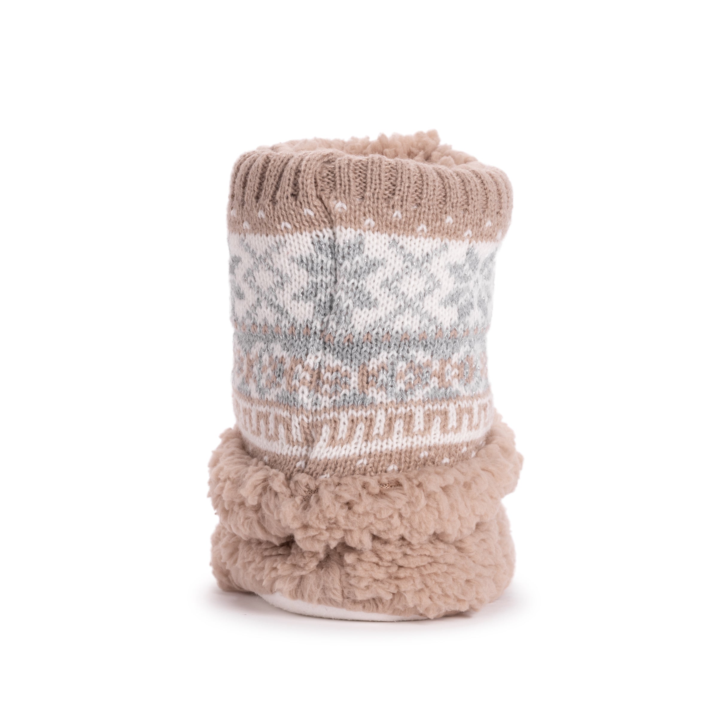 Pull on, Soft faux sherpa outer material, PVC Non skid bottom for additional grip, Stretchy material for easy on and off