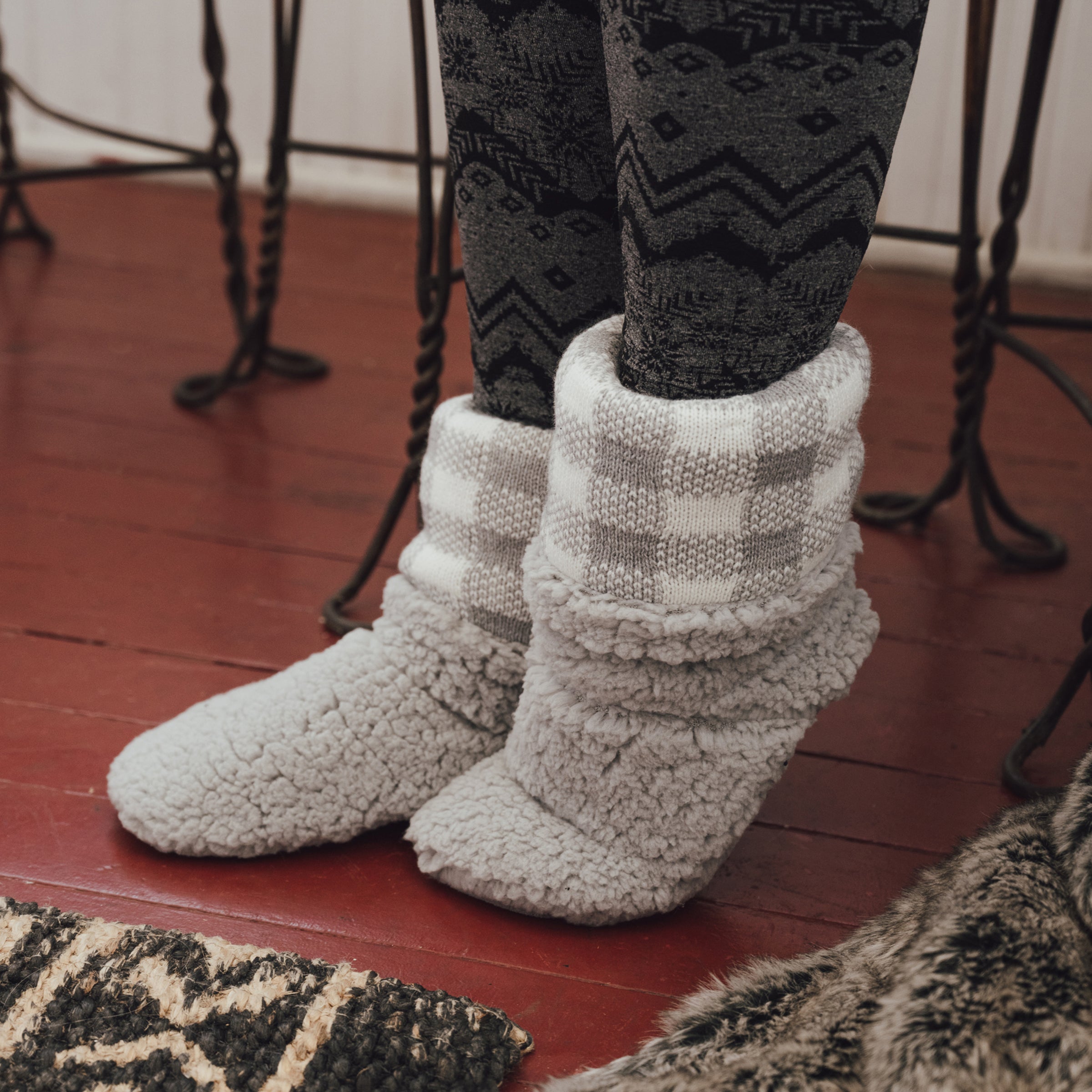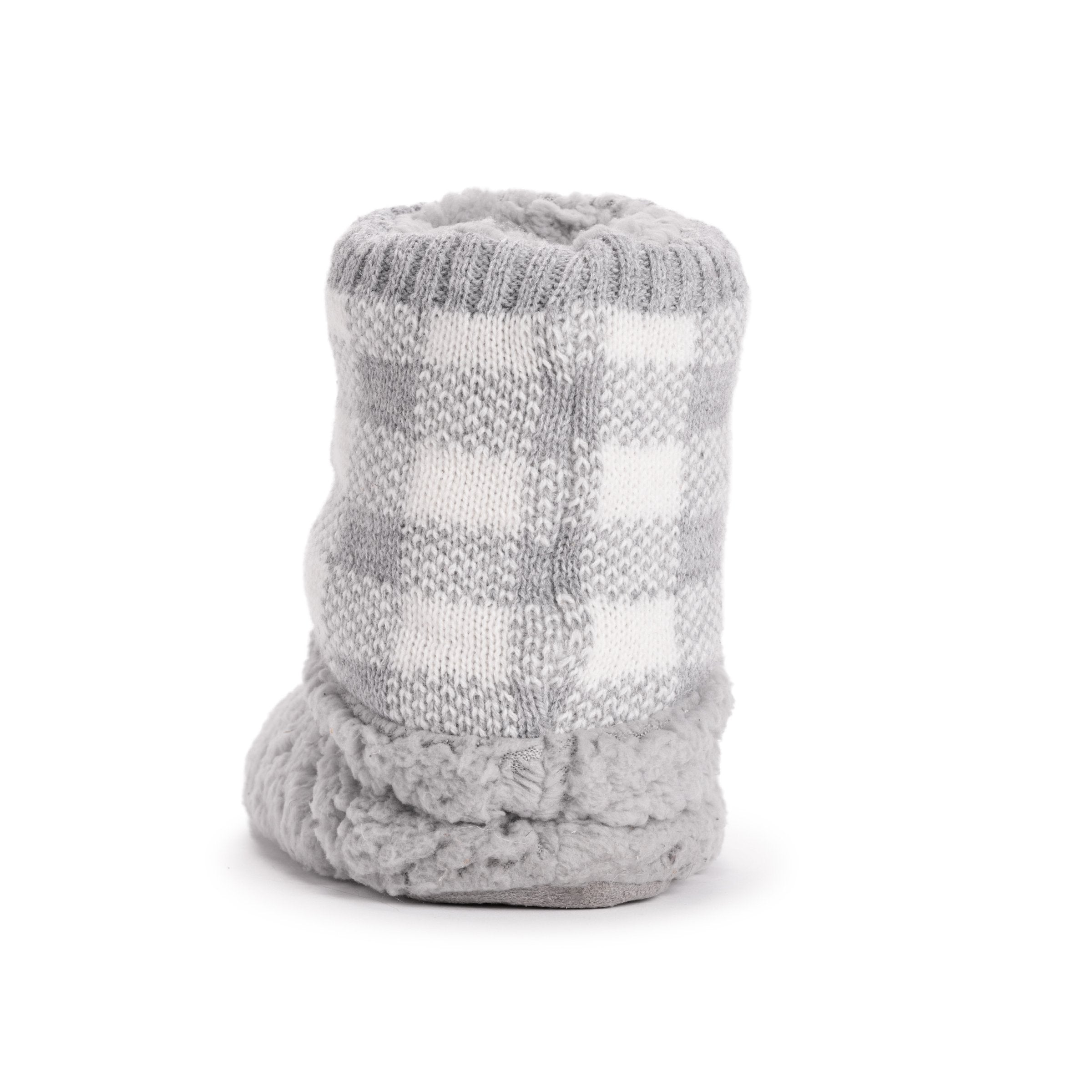 Pull on, Soft faux sherpa outer material, PVC Non skid bottom for additional grip, Stretchy material for easy on and off