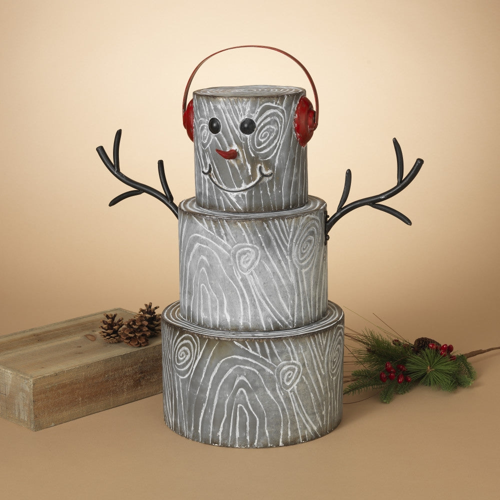 This snowman will greet your guests at the door for you! Set him on a covered porch or inside your entryway to give his warm wish to all your visitors. Frosty is made of white-washed silver galvanized metal logs stacked to make his body. He has dark button eyes, and a little red nose, and he smiles as he reaches out with dark metal branch arms. He wears red earmuffs that double as a handle so you can easily carry him room to room. Add this smiling dapper fellow to your winter decor, he will be favorite for years to come.