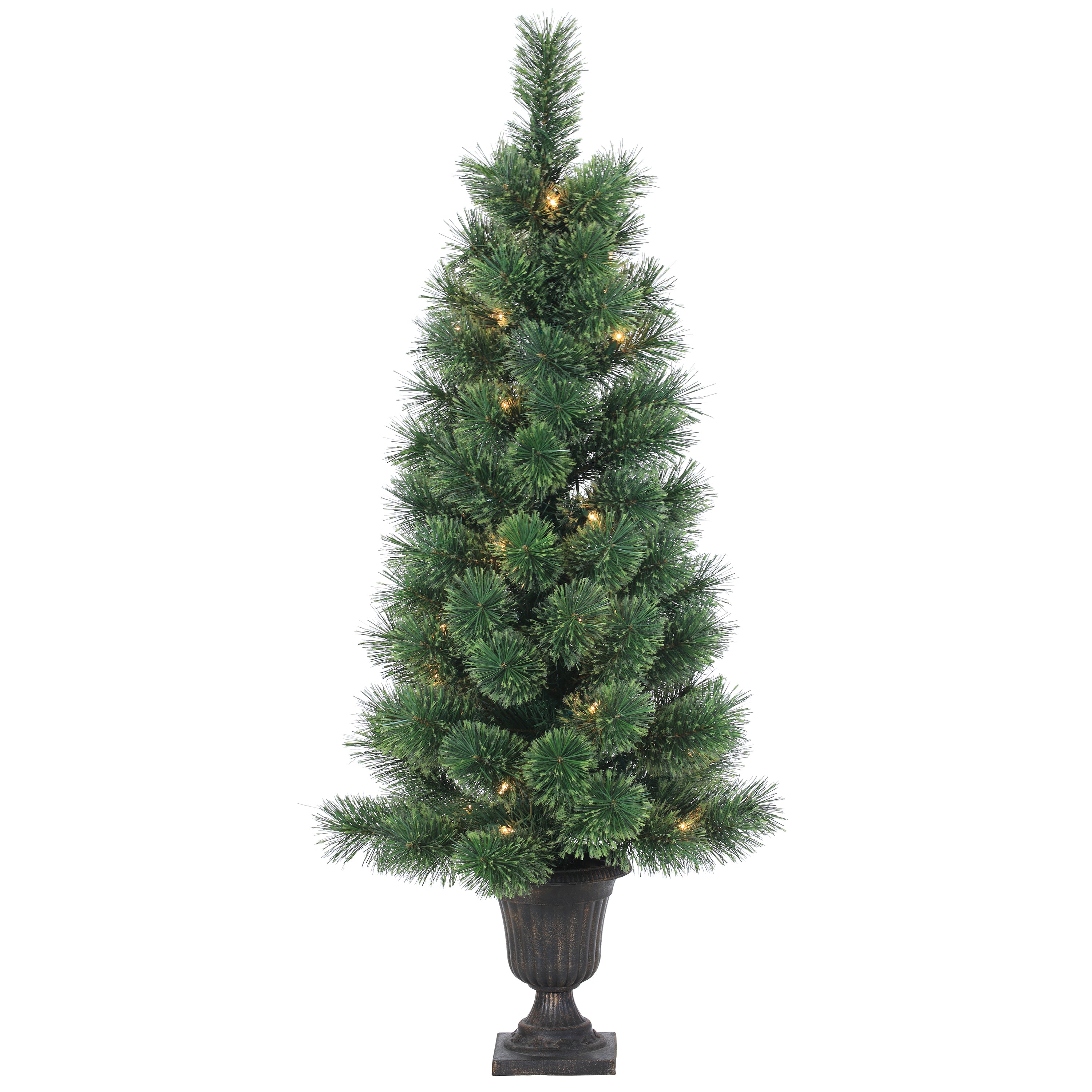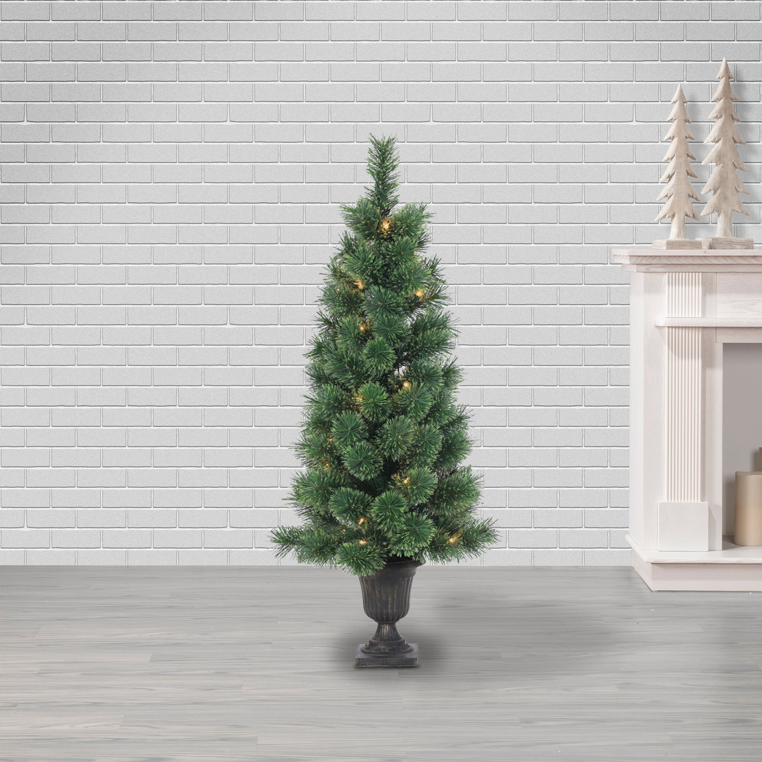A combination of cozy and classy, our pre-lit Potted Hard/Mixed Needle Cashmere Pine makes for the perfect Christmas tree where floor space is at a premium. Our tree stands 3.5 feet high and measures 18-inches at the base, giving a soft holiday glow with 50 pre-strung lights. Its 93 tips allow for your treasured decorations and rests in a decorative resin pot for stability while adding hint of elegance to your holiday decor. Tree and needles are fire resistant for your safety.