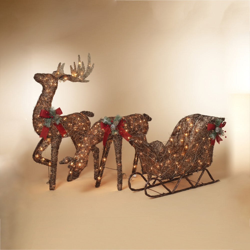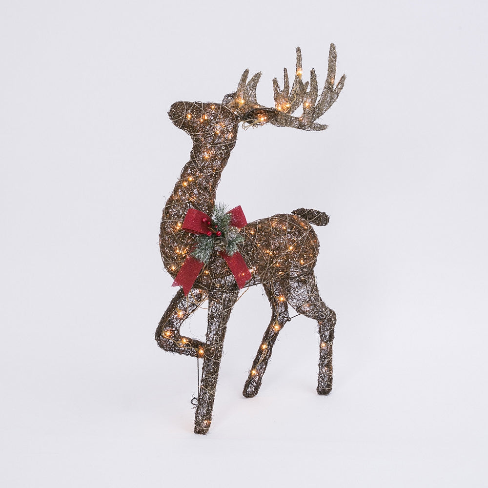 Add this graceful, standing buck to your yard to chase away the dark. Made from organic vine and twigs, this magnificent stag is ready to be hitched up to a decorative sleigh to create a display that will delight your friends and guests. A bright white string-light adds twinkling sparkle to the holiday accents of red bow, frosted pine sprigs and pine cones. Celebrate the winter season with this deer, it can be left in the yard for months to enjoy.