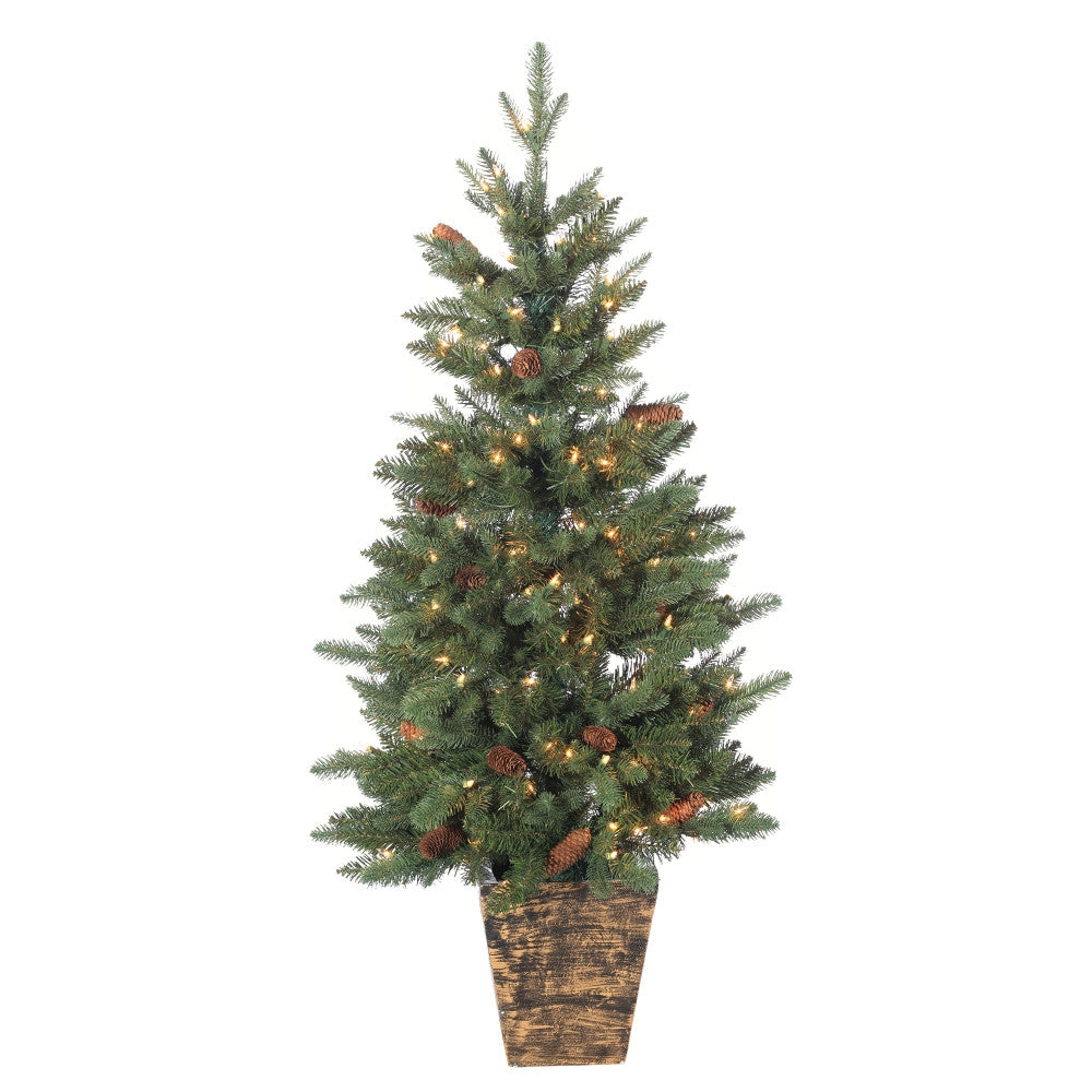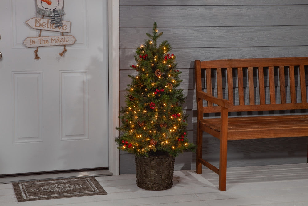 A combination of cozy and classy, our beautiful hard mixed needle, pre-lit potted Natural Cut Riverton Pine is the perfect Christmas tree where floor space is at a premium. This stunning tree stands 4-feet high and measures 23-inches at the base, giving a soft holiday glow with 150 pre-strung clear white lights. Pine cones and berries are scattered though it's 262 branch tips that allow plenty of room for your treasured decorations. This tree rests in a gorgeous decorative pot for stability while adding a hint of elegance to your holiday decor. This lovely tree and its fir needles are fire resistant for your safety.