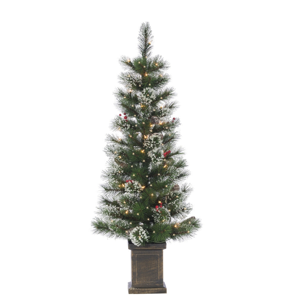 Add a touch of class and elegance to your holiday season with this matching set of potted hard mix needle Loveland Spruce trees. Both spruce trees are illuminated with 50 softly glowing, pre-strung clear incandescent lights, and each will add a memorable elegance to your holiday décor. The tips of the branches feature ice crystals for a frosty look, and scattered among the branches are attractive pine cones and red berries. Each potted tree is 4-feet in height and 18-inches at the base and has 90 branch tips for your favorite family ornaments and heirlooms. This tree rests in a gorgeous decorative pot for stability while adding a hint of elegance to your holiday decor. This lovely tree and it's spruce needles are fire resistant for your safety.