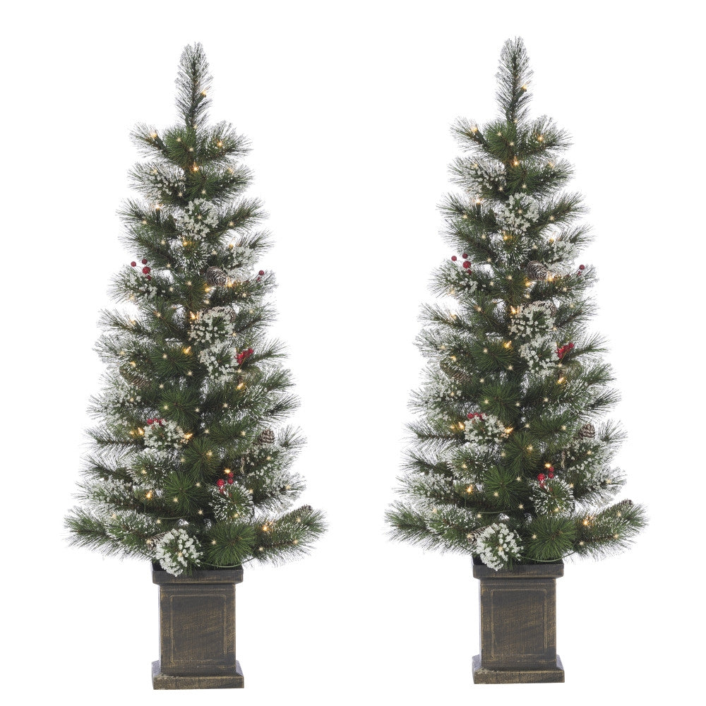 4Ft Potted Hard Mixed Needle Loveland Spruce with Iced Tips, Pine Cones, Red Berries and 50 Clear White Lights (Set of 2)