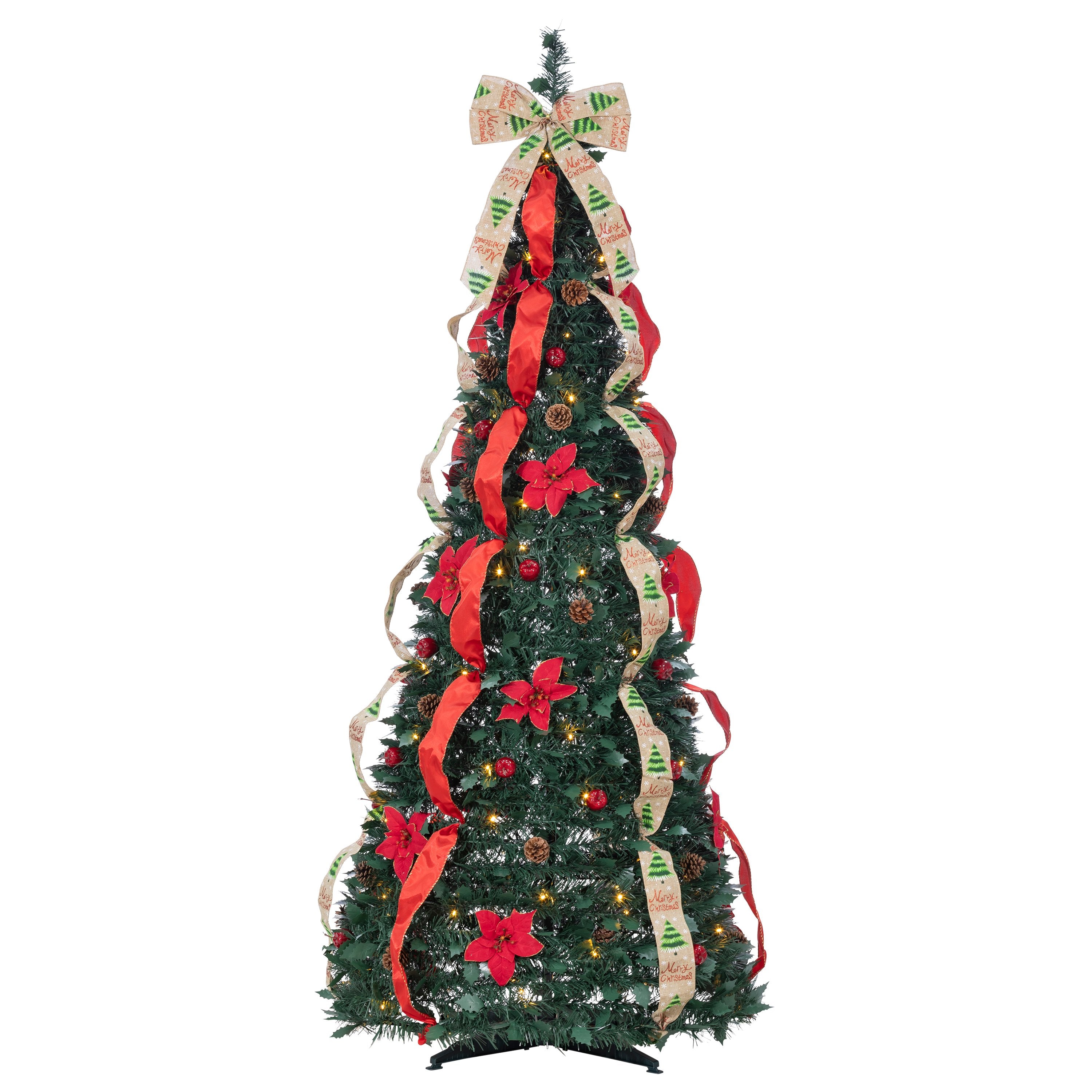 For those with lots of holiday sprit but not as much time and energy, this is a holiday tree that is light, easy to assemble, and space saving to store. Create an instant holiday tree, when you pull this 6-foot high x 30-inch base green tree out of the box and attach to the center pole and stand. Pre enhanced with red and gold balls, flowers and ribbons have been added, to go with your decorations and theme. A string of 100 energy efficient LED lights will sparkle and shine to illuminate all your holiday decor. Great for small spaces, this decor is ideal for apartments, dorm rooms, class rooms and office spaces, anywhere a little winter holiday spirit is wanted with ease of put up and take down. / Assembled Tree Dimensions: 30-in L x 30-in W x 72-in H / Nothing could be more simple than the setup of this fully decorated pop up tree / Complete with 100 UL warm white lights, strands of ribbons, poinsettias, pine cones and red berries / The festive spirit of a beautiful Christmas tree with almost no work / Easy to assemble and take down, hook the top of the tree into the center pole and plug in / This tree folds down and can be stored in a flat box when not in use.