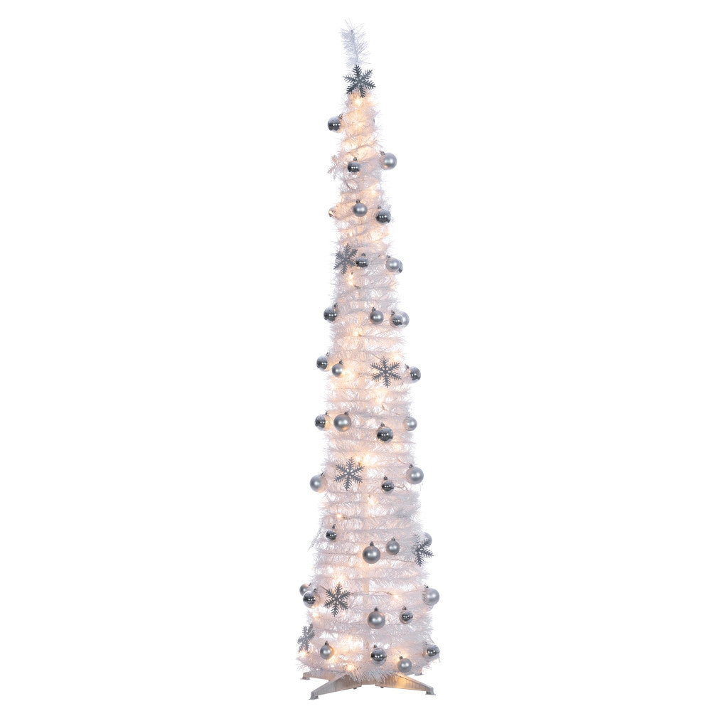 Easy, fun and festive this 6-foot high white pop up pre-lit decorated tree is great for small spaces and easy to store when not in use, it has a 14-inch wide base. This lighted tree is powered by a UL-Listed cord for your safety. A string of 100 clear warm white 5mm micro LED lights are woven into this tree for sparkle and shine. Made from metal, wire, and pvc for a sturdy and attractive home décor accent. Easy to assemble and take down, hook the top of the tree into the center pole and plug in. This tree folds down and can be stored in a flat box when not in use.