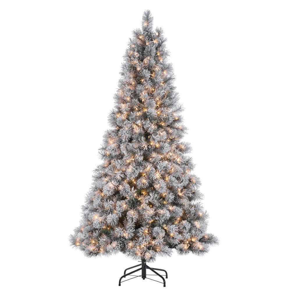 Bring the beauty of fresh fallen snow into your home décor with this 7.5-foot high pre-lit flocked mixed needle Boise Pine in a metal stand. This lighted tree is powered by a UL-Listed cord for your safety. A string of 600 clear warm white LED lights are woven into this tree for sparkle and shine. Made from metal, wire and pvc for a sturdy and attractive home décor accent. This tree has a fluffy natural snowy appearance with 746 pine tips and a base width of 52-inch. Metal tree stand is included.